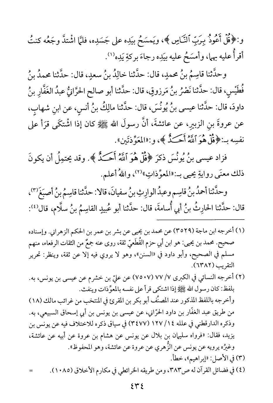 وحَدَّثَنَا قاسِمُ بنُ محمدٍ، قال: حَدَّثَنَا خالِدُ بنُ سعدٍ، قال: حَدَّثَنَا محمدُ بنُ فُطَيْسٍ، قال: حَدَّثَنَا نَصْرُ بنُ مَرزوقٍ، قال: حَدَّثَنَا أبو صالح الحرَّانيُّ عبدُ الغَفَّارِ بنُ داودَ، قال: حَدَّثَنَا عيسى بنُ يُونُسَ، قال: حَدَّثَنَا مالِكُ بنُ أَنَسٍ، عن ابنِ شهابٍ، عن عروةَ بنِ الزبيرِ، عن عائشةَ، أنَّ رسولَ الله - صَلَّى اللهُ عَلَيْهِ وَسَلَّمَ - كان إذا اشْتكَى قرَأ على نفسِه بـ: {قُلْ هُوَ اللَّهُ أَحَدٌ}، و: "المعَوِّذتَين".