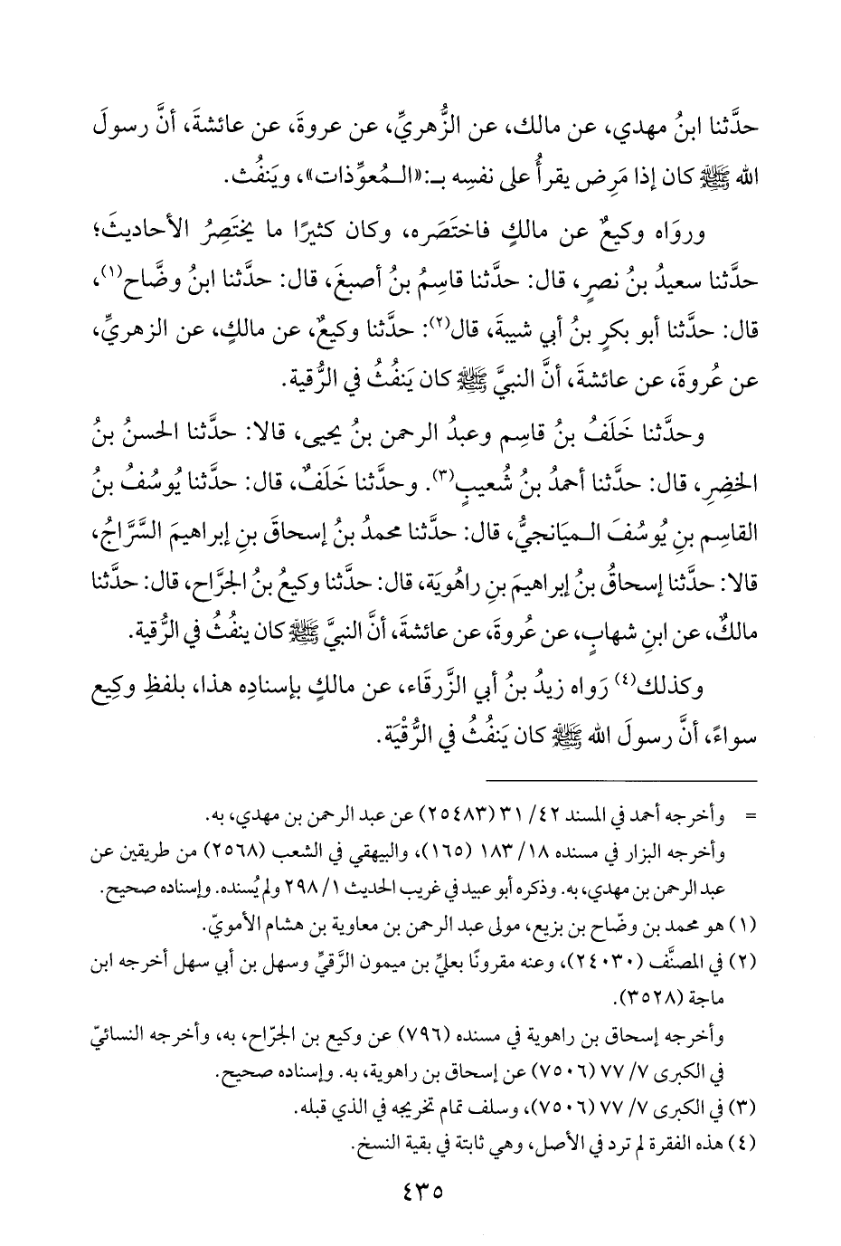 وحَدَّثَنَا خَلَفُ بنُ قاسِم وعبدُ الرَّحمن بنُ يحيى، قالا: حَدَّثَنَا الحسنُ بنُ الخضِرِ، قال: حَدَّثَنَا أحمدُ بنُ شُعيبٍ (¬٣). وحَدَّثَنَا خَلَفٌ، قال: حَدَّثَنَا يُوسُفُ بنُ القاسِم بنِ يُوسُفَ الميَانجيُّ، قال: حَدَّثَنَا محمدُ بنُ إسحاقَ بنِ إبراهيمَ السَّرَّاجُ، قالا: حَدَّثَنَا إسحاقُ بنُ إبراهيمَ بنِ راهُويَة، قال: حَدَّثَنَا وكيعُ بنُ الجرَّاح، قال: حَدَّثَنَا مالكٌ، عن ابنِ شهابٍ، عن عُروةَ، عن عائشةَ، أنَّ النبيَّ - صَلَّى اللهُ عَلَيْهِ وَسَلَّمَ - كان ينفُثُ في الرُّقية.