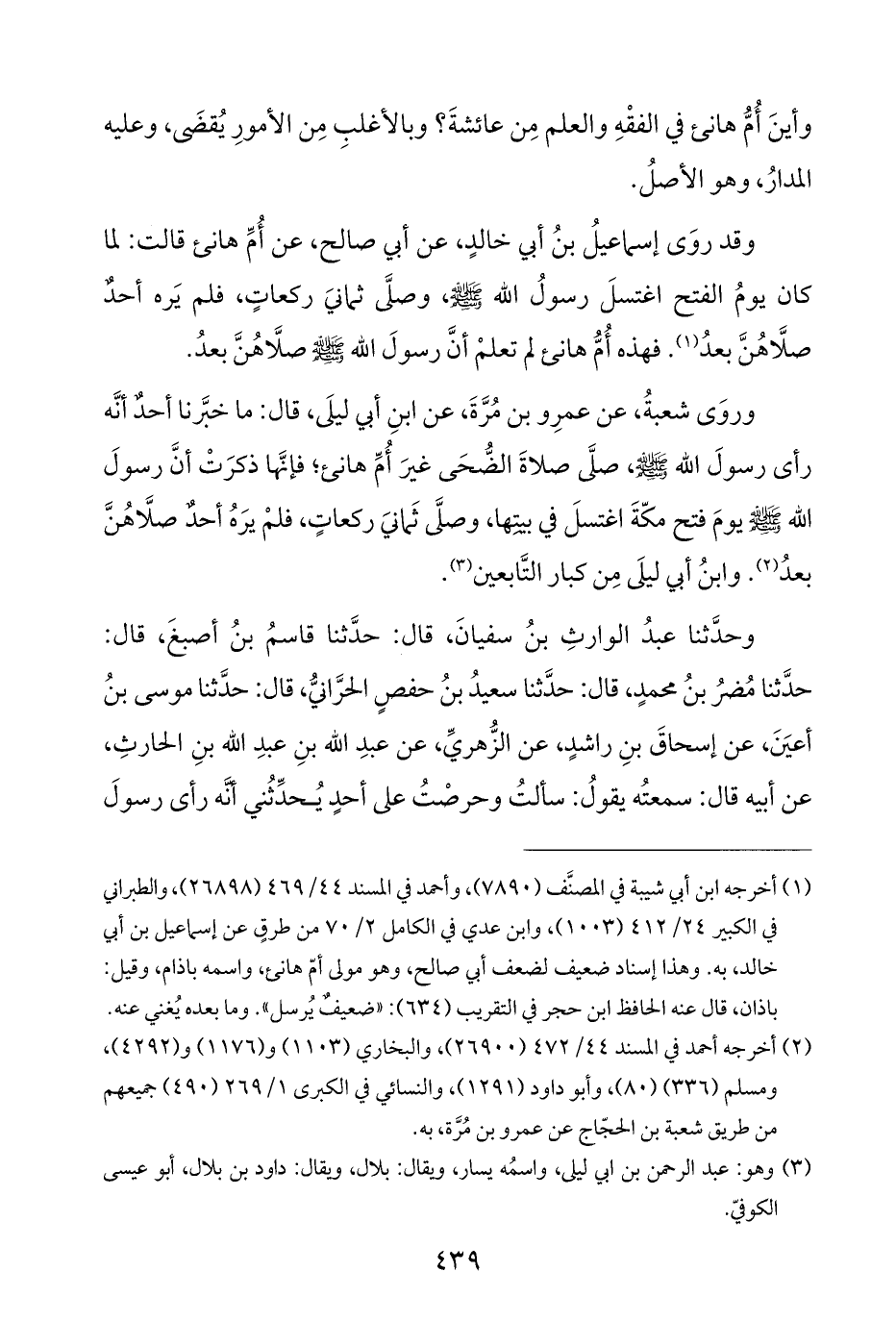وروَى شعبةُ، عن عمرِو بن مُرَّةَ، عن ابنِ أبي ليلَي، قال: ما خبَّرنا أحدٌ أنَّه رأى رسولَ الله - صَلَّى اللهُ عَلَيْهِ وَسَلَّمَ -، صلَّى صلاةَ الضُّحَى غيرَ أُمِّ هانئ؛ فإنَّها ذكرَتْ أنَّ رسولَ الله - صَلَّى اللهُ عَلَيْهِ وَسَلَّمَ - يومَ فتح مكّةَ اغتسلَ في بيتِها، وصلَّى ثَمانيَ ركعاتٍ، فلمْ يرَهُ أحدٌ صلَّاهُنَّ بعدُ (¬٢). وابنُ أبي ليلَى مِن كبار التَّابعين (¬٣).