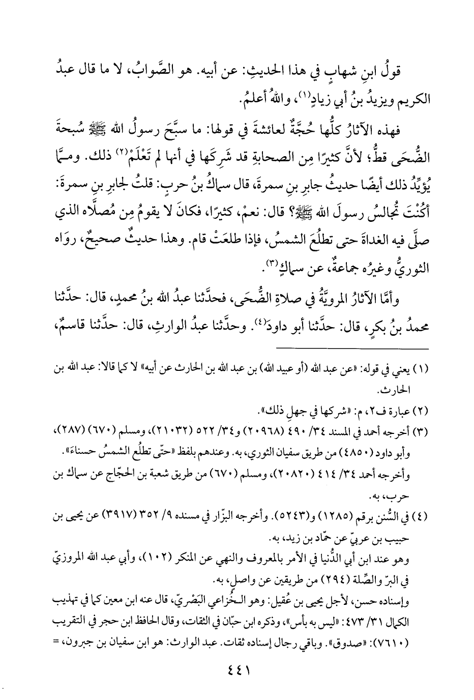 فهذه الآثارُ كلُّها حُجَّةٌ لعائشةَ في قولها: ما سبَّحَ رسولُ الله - صَلَّى اللهُ عَلَيْهِ وَسَلَّمَ - سُبحةَ الضُّحَى قطُّ؛ لأنَّ كثيرًا مِن الصحابةِ قد شَرِكَها في أنَّها لَمْ تَعْلَمْ (¬٢) ذلك. وممَّا يُؤيِّدُ ذلك أيضًا حديثُ جابرِ بنِ سمرةَ، قال سماكُ بنُ حربٍ: قلتُ لجابرِ بنِ سمرةَ: أكُنْتَ تُجالسُ رسولَ الله - صَلَّى اللهُ عَلَيْهِ وَسَلَّمَ -؟ قال: نعمْ، كثيرًا، فكانَ لا يقومُ مِن مُصلَّاه الذي صلَّى فيه الغداةَ حتى تطلُعَ الشمسُ، فإذا طلعَتْ قام. وهذا حديثٌ صحيحٌ، روَاه الثوريُّ وغيرُه جماعةٌ، عن سماكٍ (¬٣).
