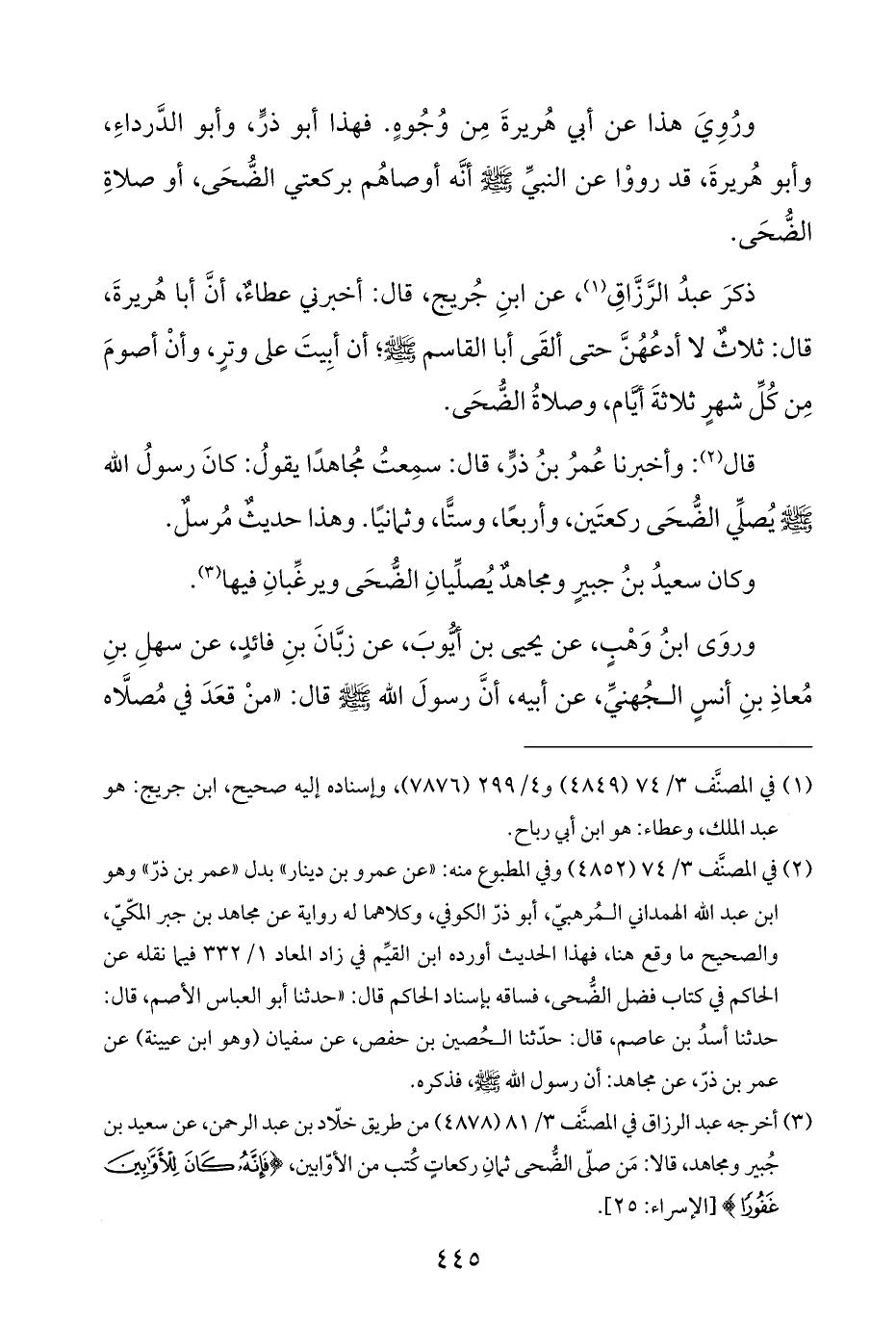(¬٣) أخرجه عبد الرزاق في المصنَّف ٣/ ٨١ (٤٨٧٨) من طريق خلّاد بن عبد الرَّحمن، عن سعيد بن جُبير ومجاهد، قالا: مَن صلّى الضُّحى ثمانِ ركعاتٍ كُتب من الأوّابين، {فَإِنَّهُ كَانَ لِلْأَوَّابِينَ غَفُورًا} [الإسراء: ٢٥].