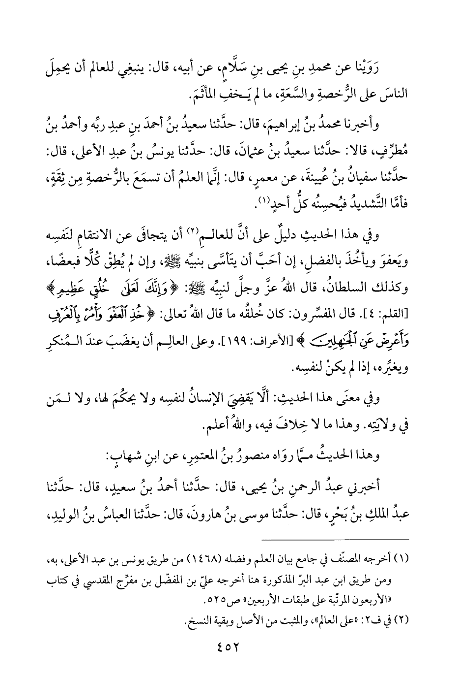 رَوَيْنا عن محمدِ بنِ يحيى بنِ سَلَّامٍ، عن أبيه، قال: ينبغِي للعالم أن يحمِلَ الناسَ على الرُّخصةِ والسَّعَةِ، ما لَمْ يَخفِ المأثَمَ.