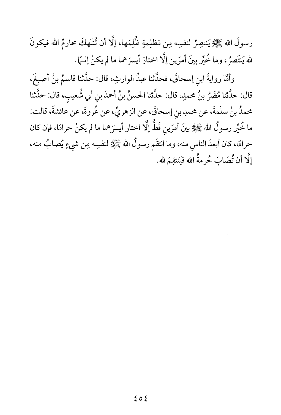 وأمَّا روايةُ ابنِ إسحاقَ، فحَدَّثَنَا عبدُ الوارثِ، قال: حَدَّثَنَا قاسمُ بنُ أصبغَ، قال: حَدَّثَنَا مُضَرُ بنُ محمدٍ، قال: حَدَّثَنَا الحسنُ بنُ أحمدَ بنِ أبي شُعيبٍ، قال: حَدَّثَنَا محمدُ بنُ سلَمةَ، عن محمدِ بنِ إسحاقَ، عن الزهريِّ، عن عُروةَ، عن عائشةَ، قالت: ما خُيِّر رسولُ الله - صَلَّى اللهُ عَلَيْهِ وَسَلَّمَ - بينَ أمرَينِ قَطُّ إلَّا اختار أيسرَهما ما لَمْ يكنْ حرامًا، فإن كان حرامًا، كان أبعدَ الناسِ منه، وما انتقَم رسولُ الله - صَلَّى اللهُ عَلَيْهِ وَسَلَّمَ - لنفسِه مِن شيءٍ يُصابُ منه، إلَّا أن تُصَابَ حُرمةُ الله فيَنتقِمَ للّه.