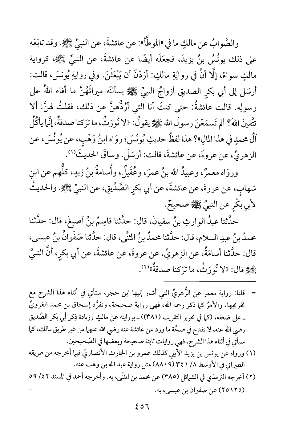 والصَّوابُ عن مالكٍ ما في "الموطَّأ": عن عائشةَ، عن النبيِّ - صَلَّى اللهُ عَلَيْهِ وَسَلَّمَ -. وقد تابَعَه على ذلك يونُسُ بنُ يزيدَ، فجعَلَه أيضًا عن عائشةَ، عن النبيِّ - صَلَّى اللهُ عَلَيْهِ وَسَلَّمَ -، كرواية مالكٍ سواءً، إلَّا أنَّ في روايَةِ مالكٍ: أرَدْنَ أن يَبْعَثْنَ. وفي روايةِ يُونسَ، قالت: أرسَل إلى أبي بكرٍ الصديقِ أزواجُ النبيِّ - صَلَّى اللهُ عَلَيْهِ وَسَلَّمَ - يسألنَه ميراثَهُنَّ ما أفاء اللهُ على رسولِه. قالت عائشةُ: حتى كنتُ أنا التي أرُدُّهنَّ عن ذلك، فقلتُ لهنَّ: ألا تتَّقينَ اللهَ؟ ألم تَسمَعْنَ رسولَ الله - صَلَّى اللهُ عَلَيْهِ وَسَلَّمَ - يقولُ: "لا نُورَثُ، ما ترَكنا صدقةٌ، إنَّما يأكُلُ آلُ محمدٍ في هذا المالِ"؟ هذا لفظُ حديثِ يُونُسَ؛ روَاه ابنُ وَهْبٍ، عن يُونُسَ، عن الزهريِّ، عن عروةَ، عن عائشةَ، قالت: أرسَلَ. وساقَ الحديثَ (¬١).