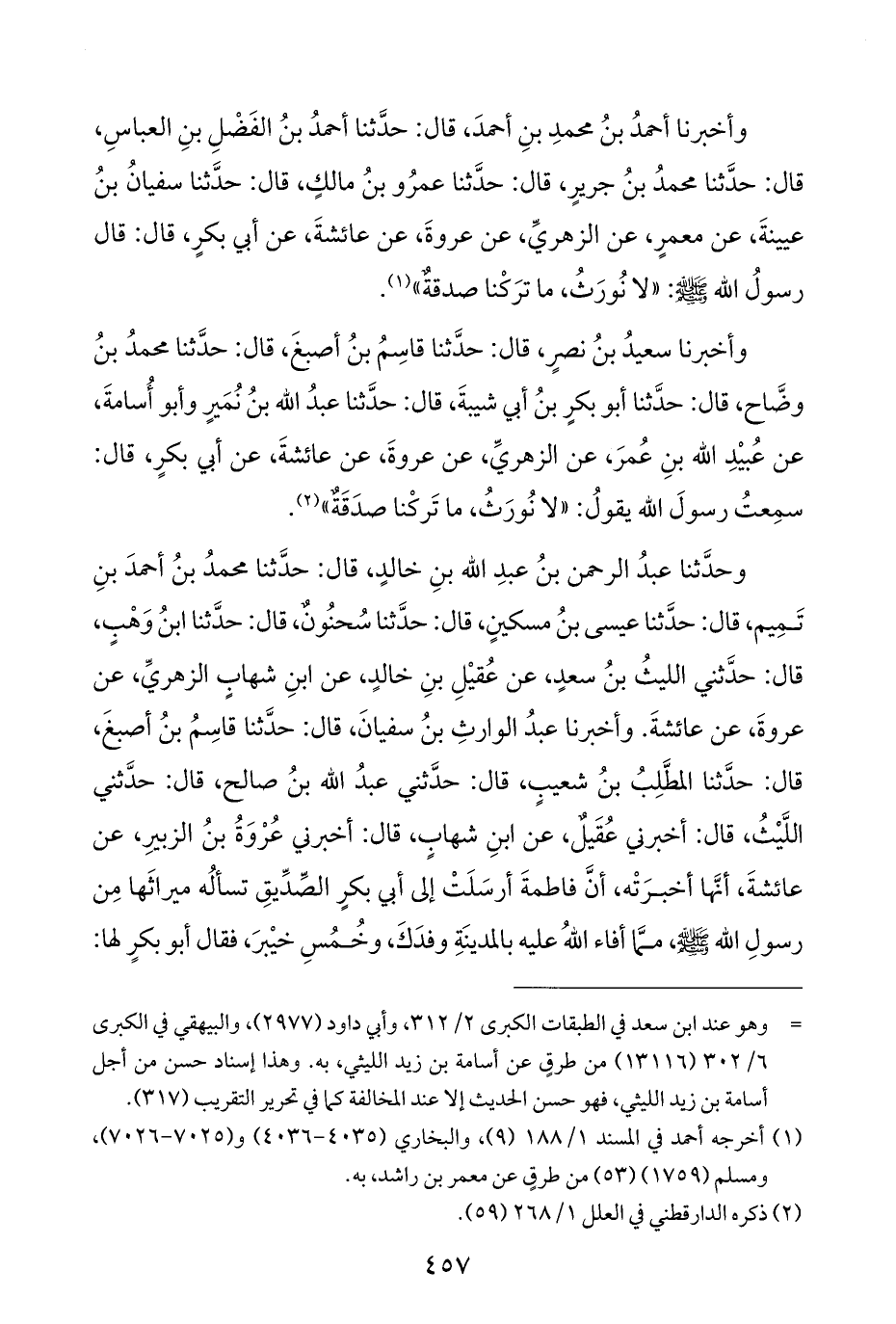وحَدَّثَنَا عبدُ الرَّحمن بنُ عبدِ الله بنِ خالدٍ، قال: حَدَّثَنَا محمدُ بنُ أحمدَ بنِ تَمِيم، قال: حَدَّثَنَا عيسى بنُ مسكينٍ، قال: حَدَّثَنَا سحنُونٌ، قال: حَدَّثَنَا ابنُ وَهْبٍ، قال: حدَّثني الليثُ بنُ سعدٍ، عن عُقيْلِ بنِ خالدٍ، عن ابنِ شهابٍ الزهريِّ، عن عروةَ، عن عائشةَ. وأخبرنا عبدُ الوارثِ بنُ سفيانَ، قال: حَدَّثَنَا قاسِمُ بنُ أصبغَ، قال: حَدَّثَنَا المطَّلِبُ بنُ شعيبٍ، قال: حدَّثني عبدُ الله بنُ صالح، قال: حدَّثني اللَّيْثُ، قال: أخبرني عُقَيلٌ، عن ابنِ شهابٍ، قال: أخبرني عُرْوَةُ بنُ الزبيرِ، عن عائشةَ، أنَّها أخبرَتْه، أنَّ فاطمةَ أرسَلَتْ إلى أبي بكرٍ الصِّدِّيقِ تسألُه ميراثَها مِن رسولِ الله - صَلَّى اللهُ عَلَيْهِ وَسَلَّمَ -، ممَّا أفاء اللهُ عليه بالمدينَةِ وفدَكَ، وخُمُسِ خيْبرَ، فقال أبو بكرٍ لها: