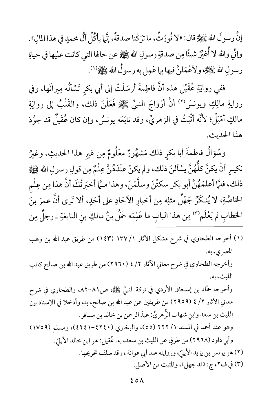 وأخرجه حمّاد بن إسحاق الأزدي في تركة النبيِّ - صَلَّى اللهُ عَلَيْهِ وَسَلَّمَ -، ص ٨١ - ٨٢، والطحاوي في شرح معاني الآثار ٢/ ٤ (٢٩٥٩) من طريقين عن عبد الله بن صالح، به، وأدخلا في الإسناد بين الليث بن سعد وابنِ شهاب الزُهريِّ: عبدَ الرَّحمن بن خالد بن مسافر.