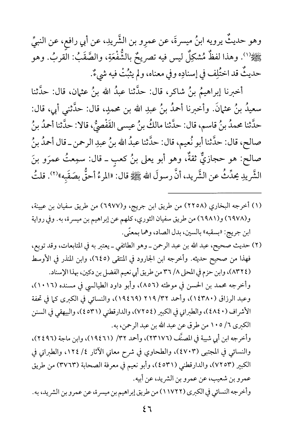 أخبرنا إبراهيمُ بنُ شاكر، قال: حدَّثنا عبدُ الله بنُ عثمان، قال: حدَّثنا سعيدُ بنُ عثمانَ. وأخبرنا أحمدُ بنُ عبدِ الله بن محمدٍ، قال: حدَّثني أبي، قال: حدَّثنا محمدُ بنُ قاسم، قال: حدَّثنا مالكُ بنُ عيسى القَفْصيُّ، قالا: حدَّثنا أحمدُ بنُ صالح، قال: حدَّثنا أبو نُعيم، قال: حدَّثنا عبدُ الله بنُ عبدِ الرحمن - قال أحمدُ بنُ صالح: هو حجازيٌّ ثقةٌ، وهو أبو يعلى بنُ كعبٍ - قال: سمِعتُ عمرَو بنَ الشَّريدِ يحدِّثُ عن الشَّريد، أنَّ رسولَ الله - صلى الله عليه وسلم - قال: "المرءُ أحقُّ بصَقَبِه" (¬٢). قلتُ