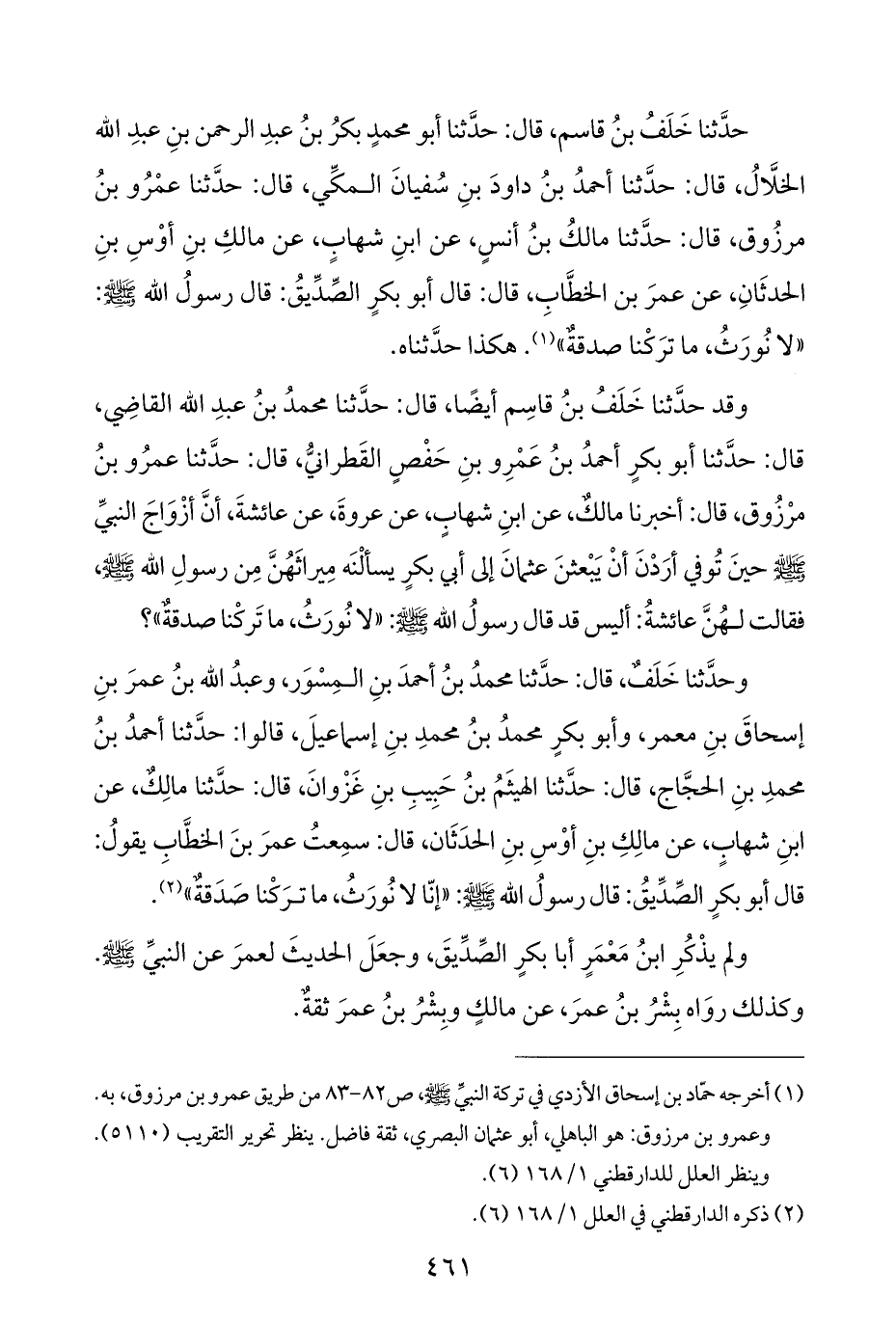 حَدَّثَنَا خَلَفُ بنُ قاسم، قال: حَدَّثَنَا أبو محمدٍ بكرُ بنُ عبدِ الرَّحمن بنِ عبدِ الله الخلَّالُ، قال: حَدَّثَنَا أحمدُ بنُ داودَ بنِ سُفيانَ المكِّي، قال: حَدَّثَنَا عمْرُو بنُ مرزُوق، قال: حَدَّثَنَا مالكُ بنُ أَنَسٍ، عن ابنِ شهابٍ، عن مالكِ بنِ أوْسِ بنِ الحدثَانِ، عن عمرَ بن الخطَّابِ، قال: قال أبو بكرٍ الصِّدِّيقُ: قال رسولُ الله - صَلَّى اللهُ عَلَيْهِ وَسَلَّمَ -: "لا نُورَثُ، ما ترَكْنا صدقةٌ" (¬١). هكذا حَدَّثَنَاه.