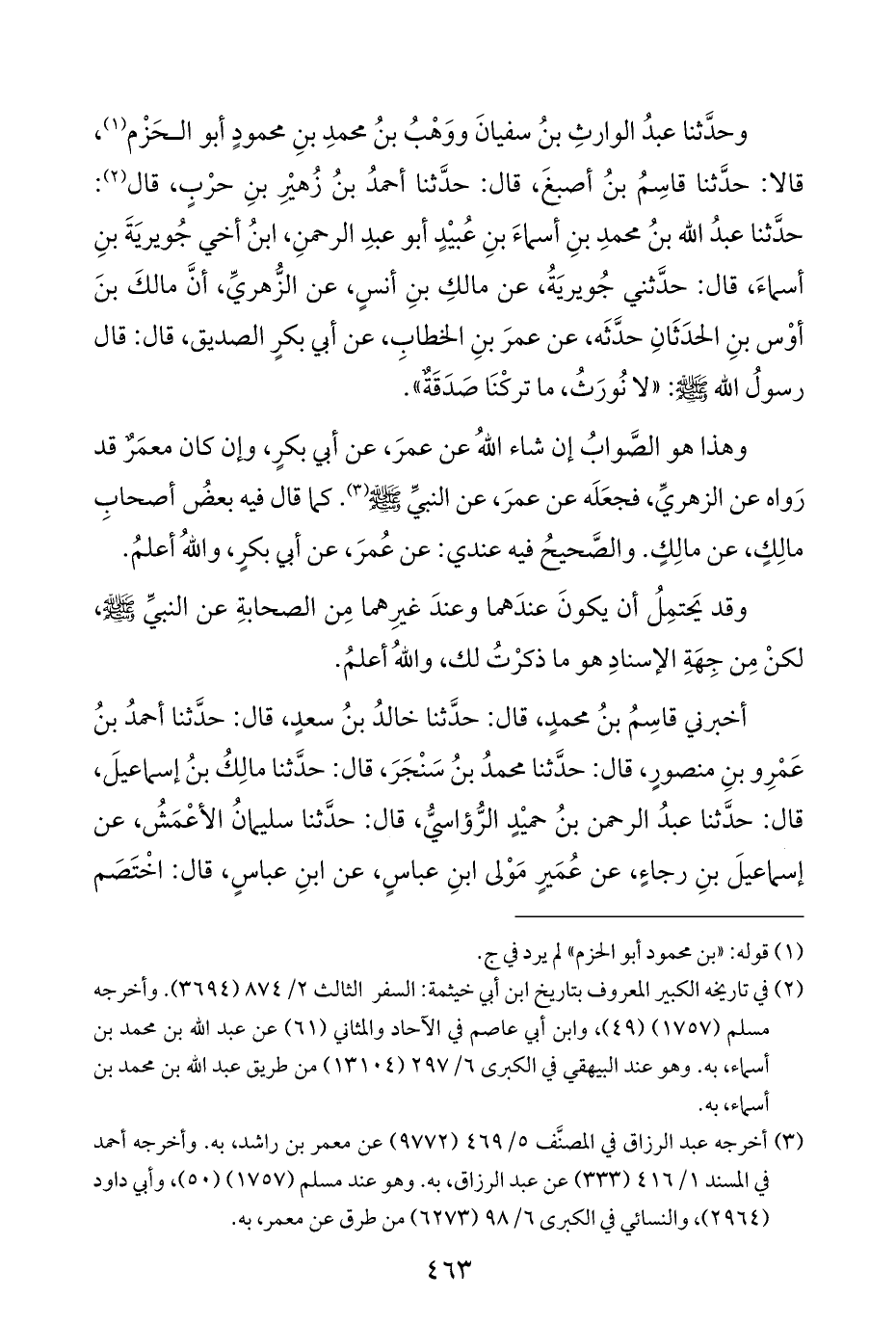 وحَدَّثَنَا عبدُ الوارثِ بنُ سفيانَ ووَهْبُ بنُ محمدِ بنِ محمودٍ أبو الحَزْم (¬١)، قالا: حَدَّثَنَا قاسِمُ بنُ أصبغَ، قال: حَدَّثَنَا أحمدُ بنُ زُهيْرِ بنِ حرْبٍ، قال (¬٢): حَدَّثَنَا عبدُ الله بنُ محمدِ بنِ أسماءَ بنِ عُبيْدٍ أبو عبدِ الرحمنِ، ابنُ أخي جُويريَةَ بنِ أسماءَ، قال: حدَّثني جُويريَةُ، عن مالكِ بنِ أَنَسٍ، عن الزُّهريِّ، أنَّ مالكَ بنَ أوْس بنِ الحدَثَانِ حدَّثَه، عن عمرَ بنِ الخطابِ، عن أبي بكرٍ الصديق، قال: قال رسولُ الله - صَلَّى اللهُ عَلَيْهِ وَسَلَّمَ -: "لا نُورَثُ، ما تركْنَا صَدَقَةٌ".