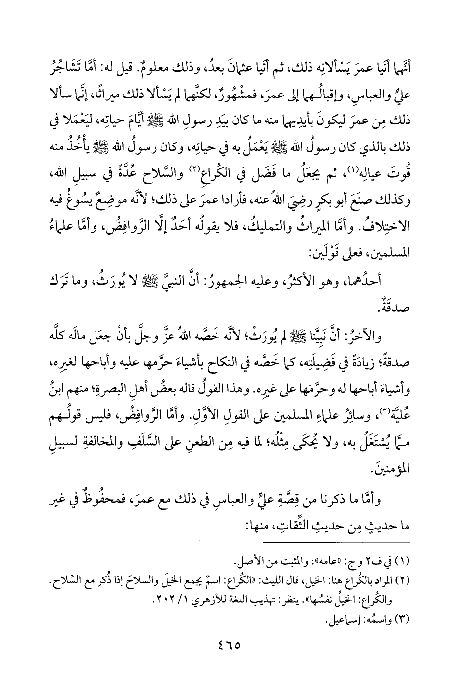أنَّهما أتَيا عمرَ يَسْألانِه ذلك، ثم أتَيا عثمانَ بعدُ، وذلك معلومٌ. قيل له: أمَّا تَشَاجُرُ عليٍّ والعباسِ، وإقبالُهما إلى عمرَ، فمشْهُورٌ، لكنَّهما لَمْ يَسْألا ذلك ميراثًا، إنَّما سألا ذلك مِن عمرَ ليكونَ بأيدِيهما منه ما كان بيَدِ رسولِ الله - صَلَّى اللهُ عَلَيْهِ وَسَلَّمَ - أيَّامٍ حياتِه، ليَعْمَلا في ذلك بالذي كان رسولُ الله - صَلَّى اللهُ عَلَيْهِ وَسَلَّمَ - يَعْمَلُ به في حياتِه، وكان رسولُ الله - صَلَّى اللهُ عَلَيْهِ وَسَلَّمَ - يأْخُذُ منه قُوتَ عيالِه (¬١)، ثم يجعَلُ ما فَضَل في الكُراعِ (¬٢) والسَّلاح عُدَّةً في سبيلِ الله، وكذلك صنَعَ أبو بكرٍ رضِيَ اللهُ عنه، فأرادا عمرَ على ذلك؛ لأنَّه موضِعٌ يسُوغُ فيه الاختِلافُ. وأمَّا الميراثُ والتمليكُ، فلا يقولُه أحَدٌ إلَّا الرَّوافِضُ، وأمَّا علماءُ المسلمين، فعلى قَوْلَين: