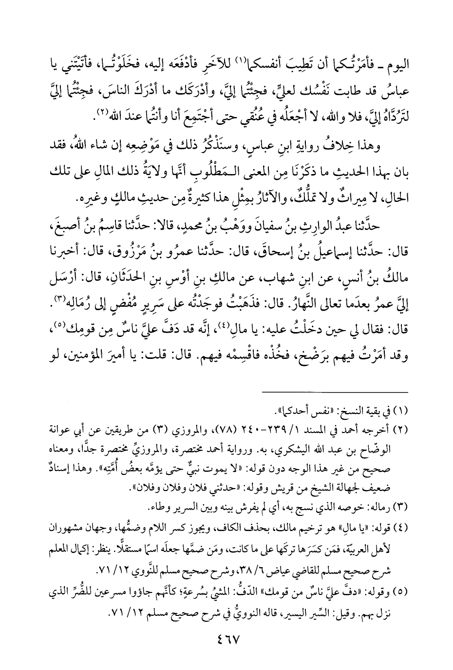 حَدَّثَنَا عبدُ الوارِثِ بنُ سفيانَ ووَهْبُ بنُ محمدٍ، قالا: حَدَّثَنَا قاسِمُ بنُ أصبغَ، قال: حَدَّثَنَا إسماعيلُ بنُ إسحاقَ، قال: حَدَّثَنَا عمرُو بنُ مَرْزُوق، قال: أخبرنا مالكُ بنُ أَنَسٍ، عن ابنِ شهاب، عن مالكِ بنِ أوْسِ بنِ الحدَثَانِ، قال: أرْسَل إليَّ عمرُ بعدَما تعالى النَّهارُ. قال: فذَهَبْتُ فوجَدْتُه على سَرِيرٍ مُفْضٍ إلى رُمَالِه (¬٣). قال: فقال لي حين دخَلْتُ عليه: يا مالِ (¬٤)، إنَّه قد دَفَّ عليَّ ناسٌ مِن قومِك (¬٥)، وقد أمَرْتُ فيهم برَضْخ، فخُذْه فاقْسِمْه فيهم. قال: قلت: يا أميرَ المؤمنين، لو