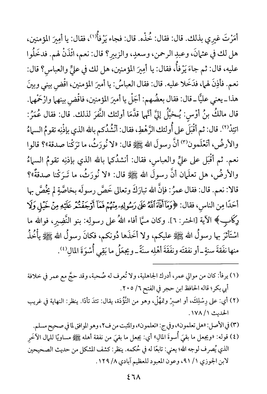 أمَرْتَ غيرِي بذلك. قال: فقال: خُذْه. قال: فجاء يَرْفأُ (¬١)، فقال: يا أمِيرَ المؤمنين، هل لك في عثمانَ، وعبدِ الرَّحمن، وسعدٍ، والزبيرِ؟ قال: نعم، ائْذَنْ لهم. فدخَلُوا عليه، قال: ثم جاءَ يَرْفأُ، فقال: يا أمِيرَ المؤمنين، هل لك في عليٍّ والعباسِ؛ قال: نعم. فأذِنَ لهما، فدَخَلا عليه. قال: فقال العباسُ: يا أميرَ المؤمنين، اقْضِ بيني وبينَ هذا - يعني عليًّا - قال: فقال بعضُهم: أجَلْ يا أميرَ المؤمنين، فاقْضِ بينهما وارْحَمْهما. قال مالكُ بنُ أوْسٍ: يُخيَّلُ إليَّ أنَّهما قدَّمَا أولئك النَّفرَ لذلك. قال: فقال عُمَرُ: اتئِد" (¬٢). قال: ثم أقْبَلَ على أُولئك الرَّهْطِ، فقال: أنْشُدُكم باللّه الذي بإذْنِه تقومُ السماءُ والأرضُ، أتَعْلَمون (¬٣) أنَّ رسولَ الله - صَلَّى اللهُ عَلَيْهِ وَسَلَّمَ - قال: "لا نُورَثُ، ما ترَكْنا صدقة"؟ قالوا نعم. ثم أقْبَل على عليٍّ والعباسِ، فقال: أنشدُكما باللّه الذي بإذنِه تقومُ السماءُ والأرضُ، هل تعلَمان أنَّ رسولَ الله - صَلَّى اللهُ عَلَيْهِ وَسَلَّمَ - قال: "لا نُورَثُ، ما تَرَكْنا صدقةٌ"؟ قالا: نعم. قال: فقال عمرُ: فإنَّ الله تبارَكَ وتعالى خَصَّ رسولَه بخاصَّةٍ لَمْ يخُصَّ بها أحَدًا مِن الناسِ، فقال: {وَمَا أَفَاءَ اللَّهُ عَلَى رَسُولِهِ مِنْهُمْ فَمَا أَوْجَفْتُمْ عَلَيْهِ مِنْ خَيْلٍ وَلَا رِكَابٍ} الآية [الحشر: ٦]. وكان ممَّا أفاء اللهُ على رسولِه: بنو النَّضِيرِ، فوالُلّه ما اسْتَأثرَ بها رسولُ الله - صَلَّى اللهُ عَلَيْهِ وَسَلَّمَ - عليكم، ولا أخَذَها دُونكم، فكانَ رسولُ الله - صَلَّى اللهُ عَلَيْهِ وَسَلَّمَ - يأْخُذُ منها نفَقةَ سنةٍ - أو نفقتَه ونفَقَةَ أهْلِه سنَةً - ويجعَلُ ما بَقِي أُسْوَةَ المالِ (¬٤).