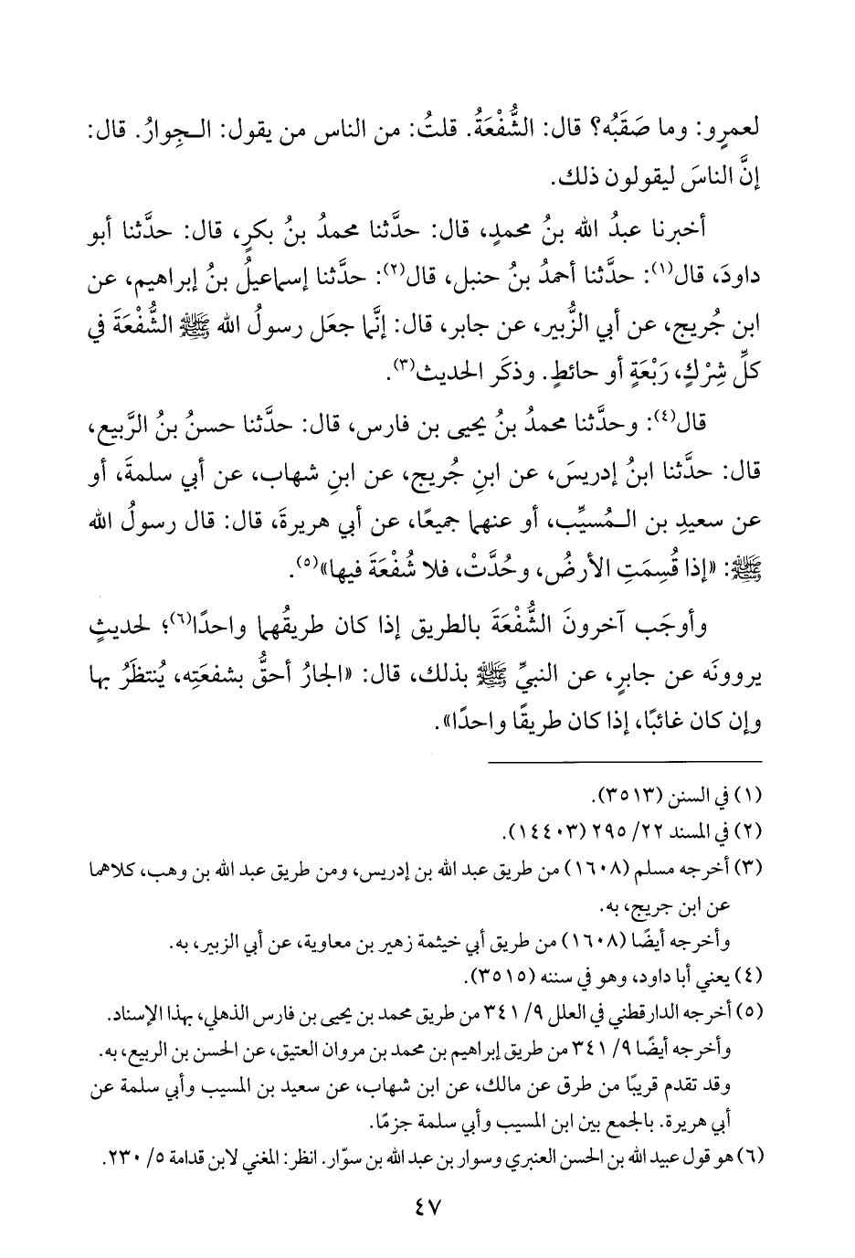 وأوجَب آخرونَ الشُّفْعَةَ بالطريق إذا كان طريقُهما واحدًا (¬٦)؛ لحديثٍ يروونَه عن جابرٍ، عن النبيِّ - صلى الله عليه وسلم - بذلك، قال: "الجارُ أحقُّ بشفعَتِه، يُنتظَرُ بها وإن كان غائبًا، إذا كان طريقًا واحدًا".