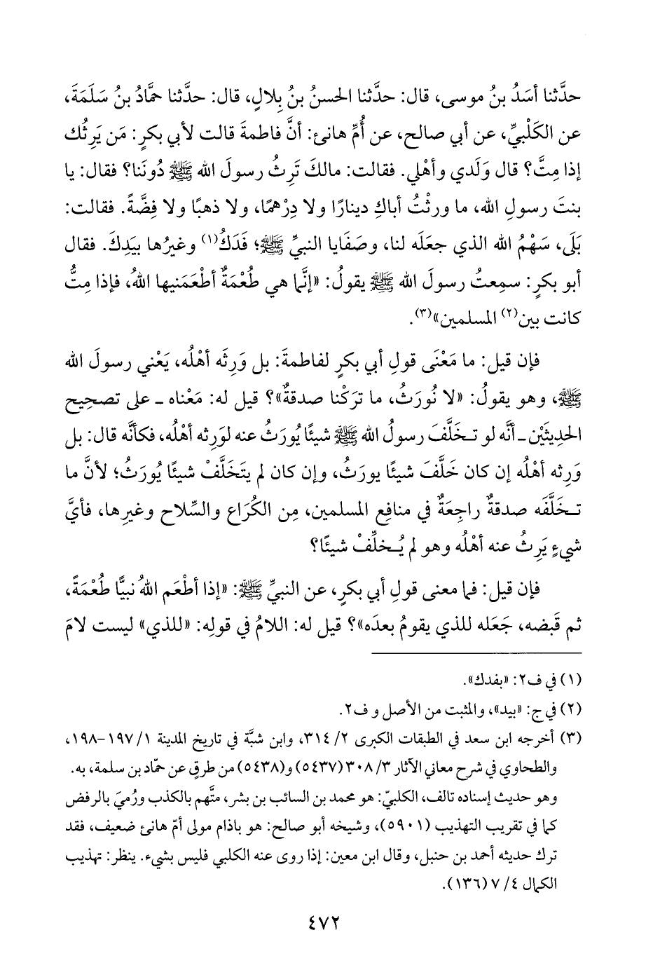حَدَّثَنَا أسَدُ بنُ موسى، قال: حَدَّثَنَا الحسنُ بنُ بِلالٍ، قال: حَدَّثَنَا حمَّادُ بنُ سَلَمَةَ، عن الكَلْبيِّ، عن أبي صالح، عن أُمِّ هانئ: أنَّ فاطمةَ قالت لأبي بكرٍ: مَن يَرِثُك إذا مِتَّ؟ قال وَلَدي وأهْلي. فقالت: ما لكَ تَرِثُ رسولَ الله - صَلَّى اللهُ عَلَيْهِ وَسَلَّمَ - دُونَنا؟ فقال: يا بنتَ رسولِ الله، ما ورثْتُ أباكِ دينارًا ولا دِرْهمًا، ولا ذهبًا ولا فِضَّةً. فقالت: بَلَى، سَهْمُ الله الذي جعَلَه لنا، وصَفَايا النبيِّ - صَلَّى اللهُ عَلَيْهِ وَسَلَّمَ -؛ فَدَكُ (¬١) وغيرُها بيَدِكَ. فقال أبو بكرٍ: سمِعتُ رسولَ الله - صَلَّى اللهُ عَلَيْهِ وَسَلَّمَ - يقولُ: "إنَّما هي طُعْمَةٌ أطْعَمَنيها اللهُ، فإذا مِتُّ كانت بين (¬٢) المسلمين" (¬٣).