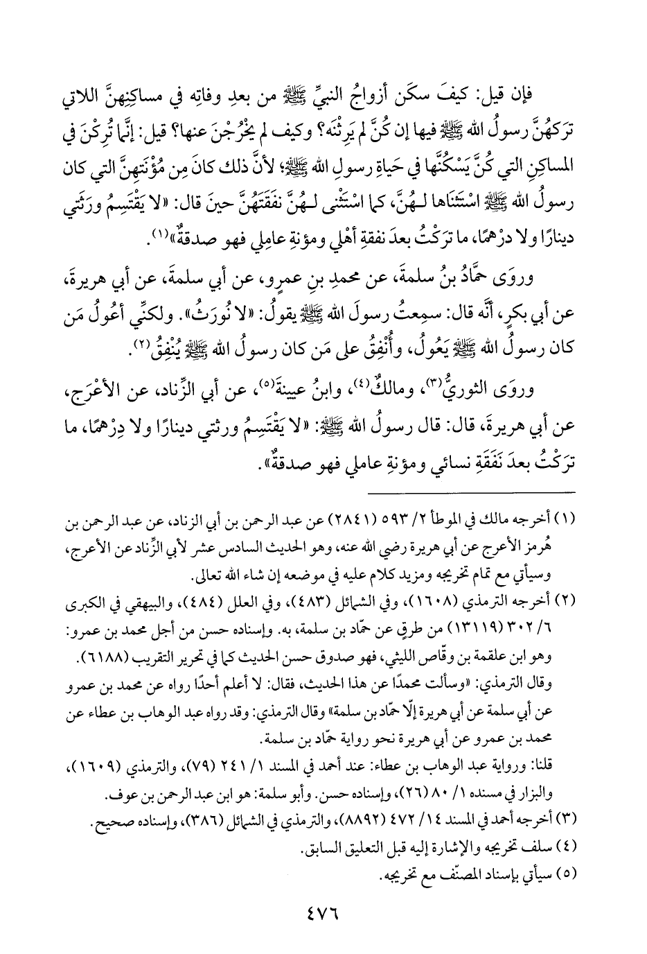 وروَى حمَّادُ بنُ سلمةَ، عن محمدِ بنِ عمرٍو، عن أبي سلمةَ، عن أبي هريرةَ، عن أبي بكرٍ، أنَّه قال: سمِعتُ رسولَ الله - صَلَّى اللهُ عَلَيْهِ وَسَلَّمَ - يقولُ: "لا نُورَثُ". ولكنِّي أعُولُ مَن كان رسولُ الله - صَلَّى اللهُ عَلَيْهِ وَسَلَّمَ - يَعُولُ، وأُنْفِقُ على مَن كان رسولُ الله - صَلَّى اللهُ عَلَيْهِ وَسَلَّمَ - يُنْفِقُ (¬٢).