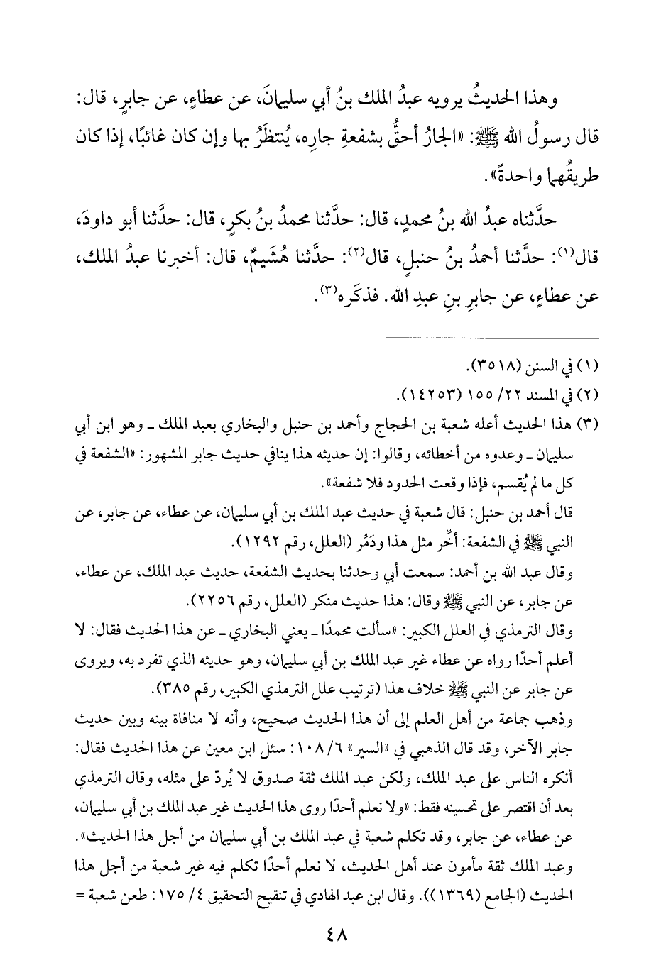 (¬٣) هذا الحديث أعله شعبة بن الحجاج وأحمد بن حنبل والبخاري بعبد الملك - وهو ابن أبي سليمان - وعدوه من أخطائه، وقالوا: إن حديثه هذا ينافي حديث جابر المشهور: "الشفعة في كل ما لم يُقسم، فإذا وقعت الحدود فلا شفعة".