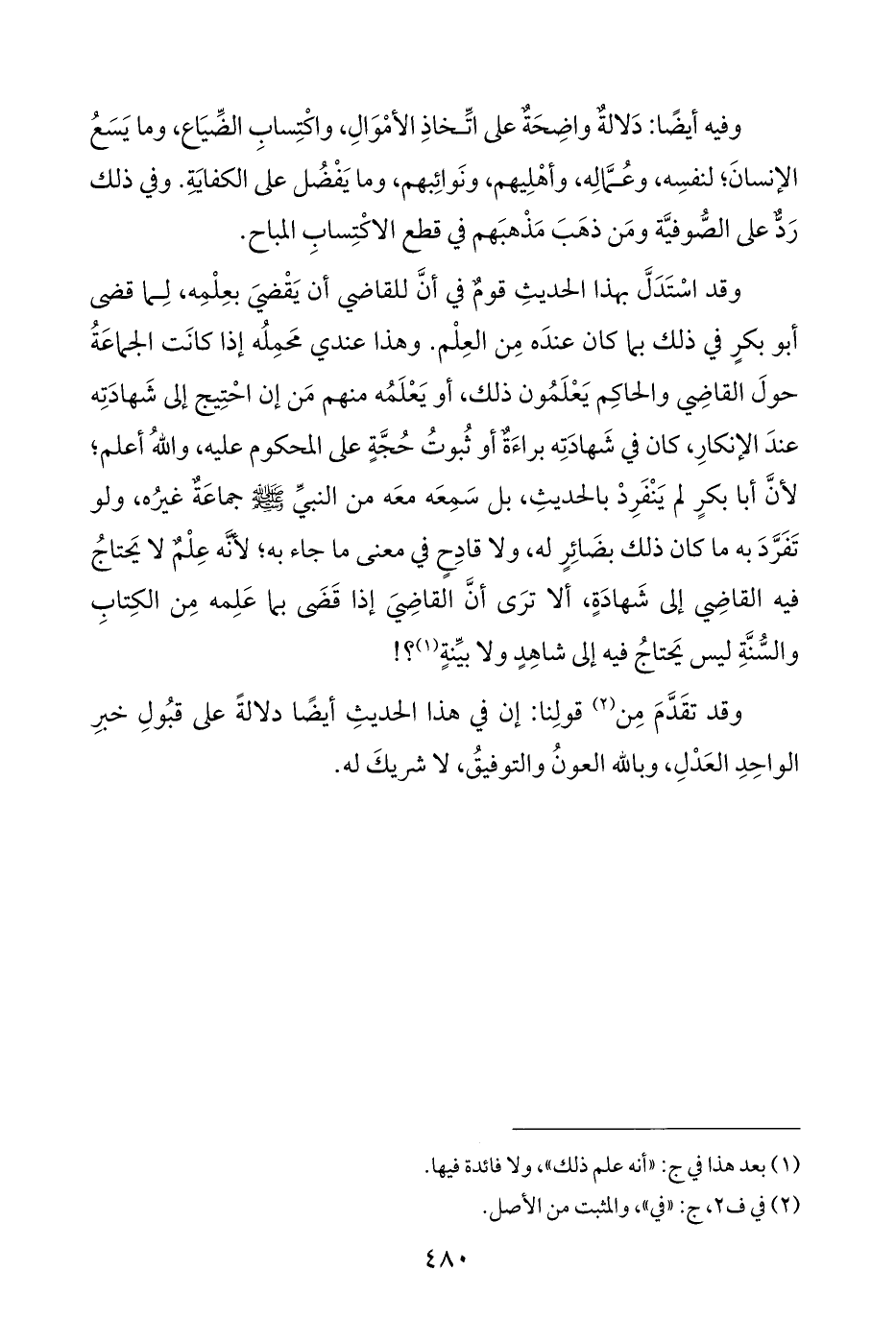 وقد اسْتَدَلَّ بهذا الحديثِ قومٌ في أنَّ للقاضي أن يَقْضيَ بعِلْمِه، لِما قضى أبو بكرٍ في ذلك بما كان عندَه مِن العِلْم. وهذا عندي مَحمِلُه إذا كانَت الجماعَةُ حولَ القاضِي والحاكِم يَعْلَمُون ذلك، أو يَعْلَمُه منهم مَن إن احْتِيج إلى شهادَتِه عندَ الإنكارِ، كان في شَهادَتِه براءَةٌ أو ثُبوتُ حُجَّةٍ على المحكوم عليه، واللّهُ أعلم؛ لأنَّ أبا بكرٍ لَمْ يَنْفَرِدْ بالحديثِ، بل سَمِعَه معَه من النبيِّ - صَلَّى اللهُ عَلَيْهِ وَسَلَّمَ - جماعَةٌ غيرُه، ولو تَفَرَّدَ به ما كان ذلك بضَائِرٍ له، ولا قادِحٍ في معنى ما جاء به؛ لأنَّه عِلْمٌ لا يَحتاجُ فيه القاضِي إلى شهادَةٍ، ألا ترَى أنَّ القاضِيَ إذا قَضى بما عَلِمه مِن الكِتابِ والسُّنَّةِ ليس يَحتاجُ فيه إلى شاهِدٍ ولا بيِّنةٍ (¬١)؟!