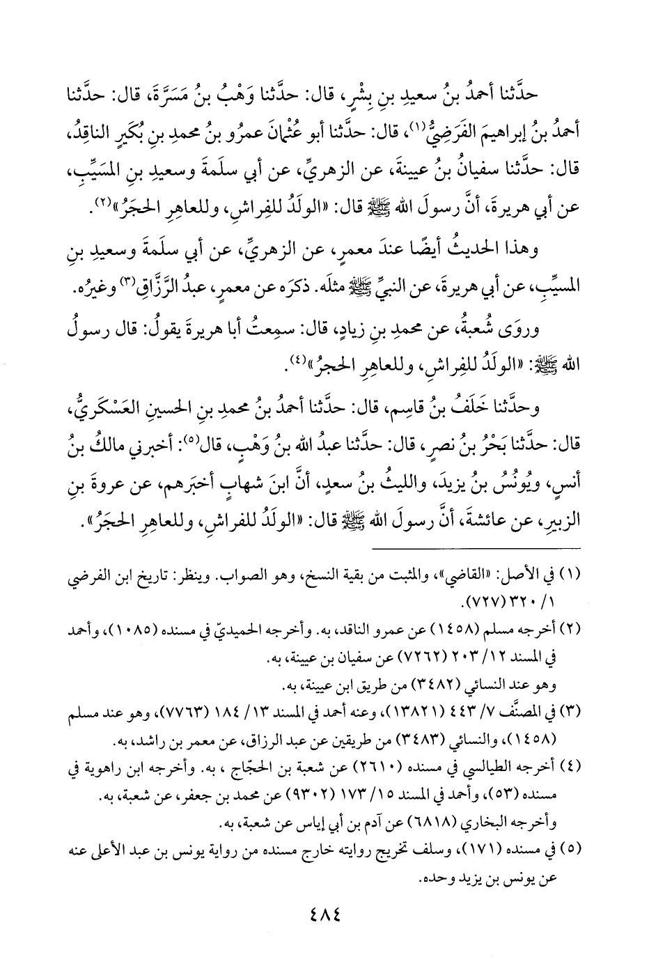 حدَّثنا أحمدُ بنُ سعيدِ بنِ بِشْرٍ، قال: حدَّثنا وَهْبُ بنُ مَسَرَّةَ، قال: حدَّثنا أحمدُ بنُ إبراهيمَ الفَرَضِيُّ (¬١)، قال: حدَّثنا أبو عُثْمانَ عمرُو بنُ محمدِ بنِ بُكَيرٍ الناقِدُ، قال: حدَّثنا سفيانُ بنُ عيينةَ، عن الزهريِّ، عن أبي سلَمةَ وسعيدِ بنِ المسَيِّبِ، عن أبي هريرةَ، أنَّ رسولَ الله - صلى الله عليه وسلم - قال: "الولَدُ للفِراشِ، وللعاهِرِ الحجَرُ" (¬٢).