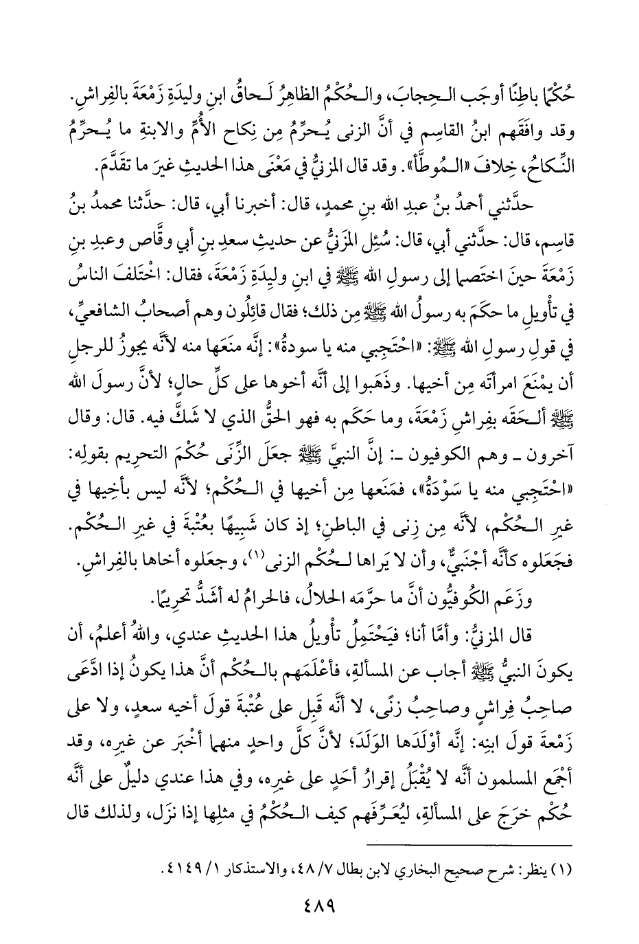 حدَّثني أحمدُ بنُ عبدِ الله بنِ محمدٍ، قال: أخبرنا أبي، قال: حدَّثنا محمدُ بنُ قاسِم، قال: حدَّثني أبي، قال: سُئِل المزَنيُّ عن حديثِ سعدِ بنِ أبي وقَّاص وعبدِ بنِ زَمْعَةَ حينَ اختَصما إلى رسولِ الله - صلى الله عليه وسلم - في ابنِ وليِدَةِ زَمْعَةَ، فقال: اخْتَلفَ الناسُ في تأْويلِ ما حكَمَ به رسولُ الله - صلى الله عليه وسلم - مِن ذلك؛ فقال قائِلُون وهم أصحابُ الشافعيِّ، في قولِ رسولِ الله - صلى الله عليه وسلم -: "احْتَجِبي منه يا سودةُ": إنَّه منَعَها منه لأنَّه يجوزُ للرجلِ أن يمْنَعَ امرأتَه مِن أخيها. وذَهَبوا إلى أنَّه أخوها على كلِّ حالٍ؛ لأنَّ رسولَ الله - صلى الله عليه وسلم - ألحَقَه بفِراشِ زَمْعَةَ، وما حَكَم به فهو الحقُّ الذي لا شَكَّ فيه. قال: وقال آخرون - وهم الكوفيون -: إنَّ النبيَّ - صلى الله عليه وسلم - جعَلَ الزِّنَى حُكْمَ التحرِيم بقولِه: "احْتَجِبي منه يا سَوْدَةُ"، فمَنَعها مِن أخيها في الحُكْم؛ لأنَّه ليس بأخِيها في غيرِ الحُكْم، لأنَّه مِن زِنى في الباطنِ؛ إذ كان شَبِيهًا بعُتْبةَ في غيرِ الحُكْم. فجَعَلوه كأنَّه أجْنَبيٌّ، وأن لا يَراها لحُكْم الزنى (¬١)، وجعَلوه أخاها بالفِراشِ.