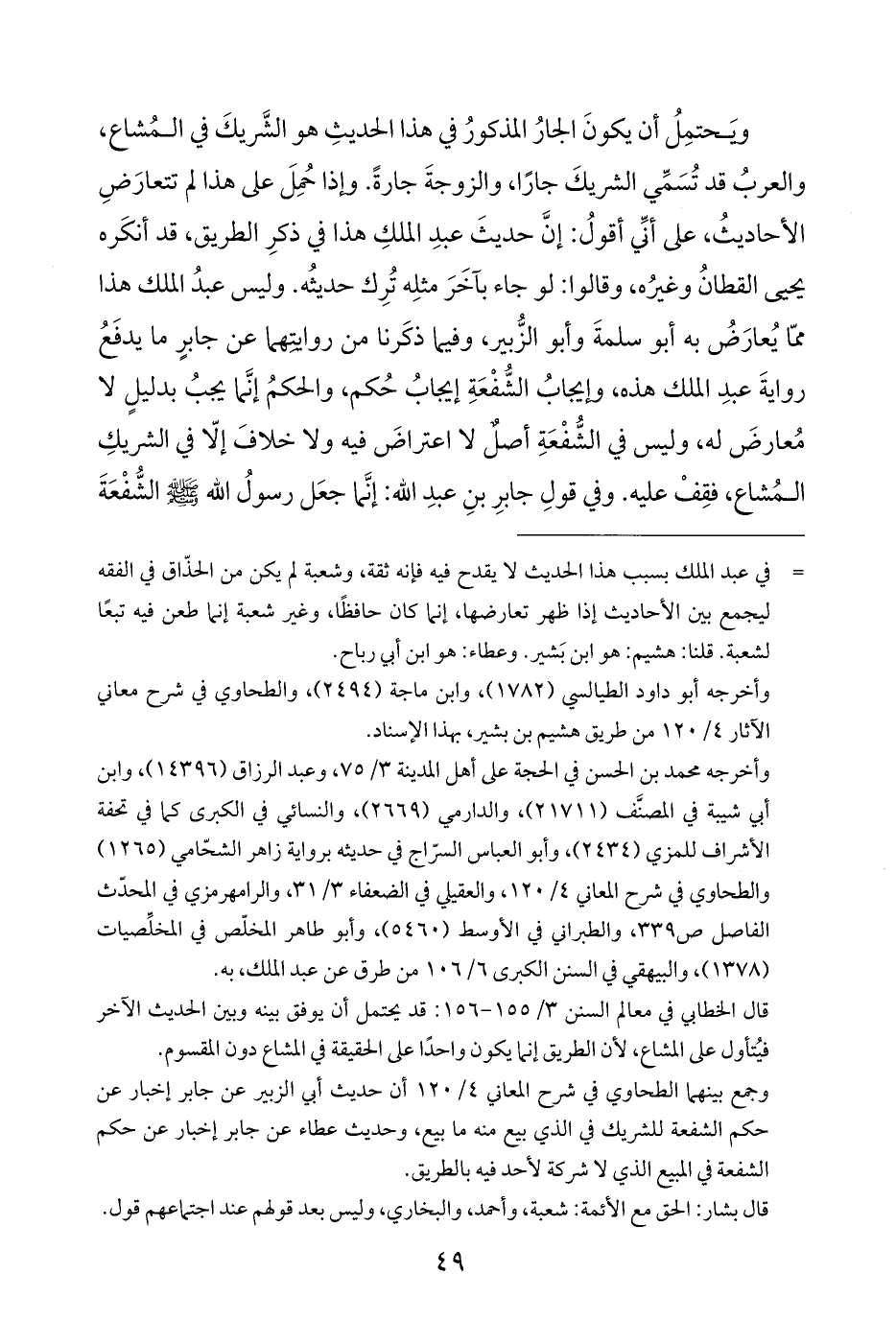 وَيَحتمِلُ أن يكونَ الجارُ المذكورُ في هذا الحديثِ هو الشَّريكَ في المُشاع، والعربُ قد تُسَمِّي الشريكَ جارًا، والزوجةَ جارةً. وإذا حُمِلَ على هذا لم تتعارَضِ الأحاديثُ، على أنِّي أقولُ: إنَّ حديثَ عبدِ الملكِ هذا في ذكرِ الطريق، قد أنكَره يحيى القطانُ وغيرُه، وقالوا: لو جاء بآخَرَ مثلِه تُرِك حديثُه. وليس عبدُ الملك هذا ممّا يُعارَضُ به أبو سلمةَ وأبو الزُّبير، وفيما ذكَرنا من روايتِهما عن جابرٍ ما يدفَعُ روايةَ عبدِ الملك هذه، وإيجابُ الشُّفْعَةِ إيجابُ حُكم، والحكمُ إنَّما يجبُ بدليلٍ لا مُعارضَ له، وليس في الشُّفْعَةِ أصلٌ لا اعتراضَ فيه ولا خلافَ إلّا في الشريكِ المُشاع، فقِفْ عليه. وفي قولِ جابرِ بنِ عبدِ الله: إنَّما جعَل رسولُ الله - صلى الله عليه وسلم - الشُّفْعَةَ
