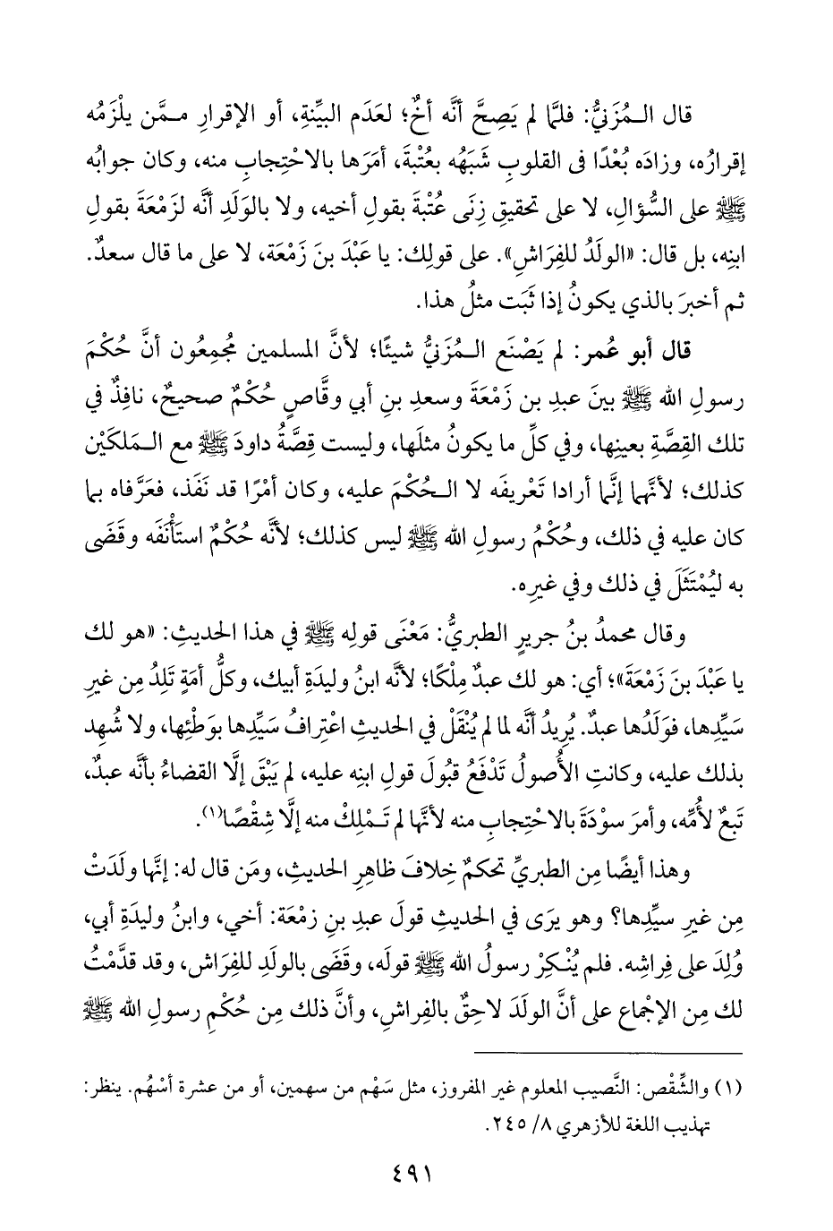 وقال محمدُ بنُ جريرٍ الطبريُّ: مَعْنَى قولِه - صلى الله عليه وسلم - في هذا الحديثِ: "هو لك يا عَبْدَ بنَ زَمْعَةَ"؛ أي: هو لك عبدٌ مِلْكًا، لأنَّه ابنُ وليدَةِ أبيك، وكلُّ أمَةٍ تَلِدُ مِن غيرِ سَيِّدِها، فوَلَدُها عبدٌ. يُرِيدُ أنَّه لما لم يُنْقَلْ في الحديثِ اعْتِرافُ سَيِّدِها بوَطْئِها، ولا شُهِد بذلك عليه، وكانتِ الأُصولُ تَدْفَعُ قبُولَ قولِ ابنِه عليه، لم يَبْقَ إلَّا القضاءُ بأنَّه عبدٌ، تَبعٌ لأُمِّه، وأمرَ سوْدَةَ بالاحْتِجابِ منه لأنَّها لم تَمْلِكْ منه إلَّا شِقْصًا (¬١).