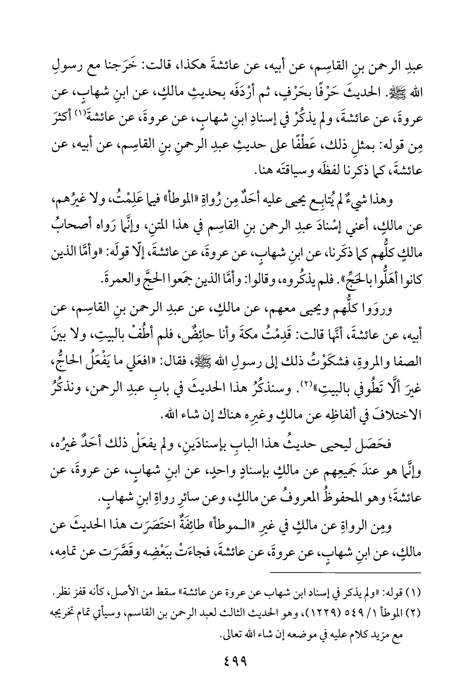 وهذا شيءٌ لم يُتابِع يحيى عليه أحَدٌ مِن رُواةِ "الموطأ" فيما عَلِمْتُ، ولا غيرُهم، عن مالكٍ، أعني إسْنادَ عبدِ الرحمن بنِ القاسِم في هذا المتنِ، وإنَّما رَواه أصحابُ مالكٍ كلُّهم كما ذكَرنا، عن ابنِ شهابٍ، عن عروةَ، عن عائشةَ، إلّا قولَه: "وأمَّا الذين كانوا أهَلُّوا بالحجِّ". فلم يذكُروه، وقالوا: وأمَّا الذين جمَعوا الحجَّ والعمرةَ.