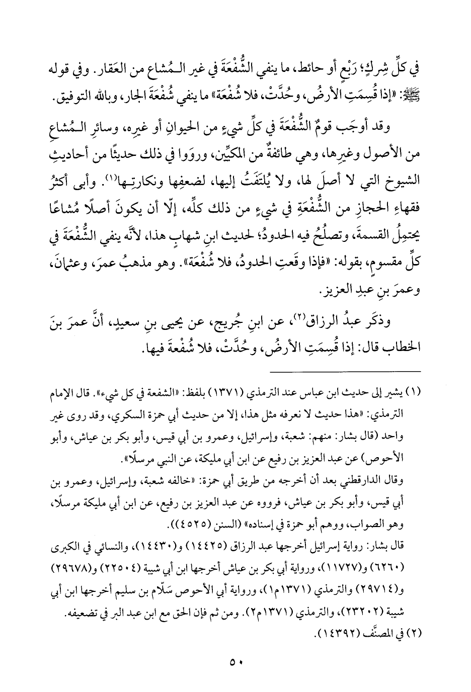 (¬١) يشير إلى حديث ابن عباس عند الترمذي (١٣٧١) بلفظ: "الشفعة في كل شيء". قال الإمام الترمذي: "هذا حديث لا نعرفه مثل هذا، إلا من حديث أبي حمزة السكري، وقد روى غير واحد (قال بشار: منهم: شعبة، وإسرائيل، وعمرو بن أبي قيس، وأبو بكر بن عياش، وأبو الأحوص) عن عبد العزيز بن رفيع عن ابن أبي مليكة، عن النبي مرسلًا".