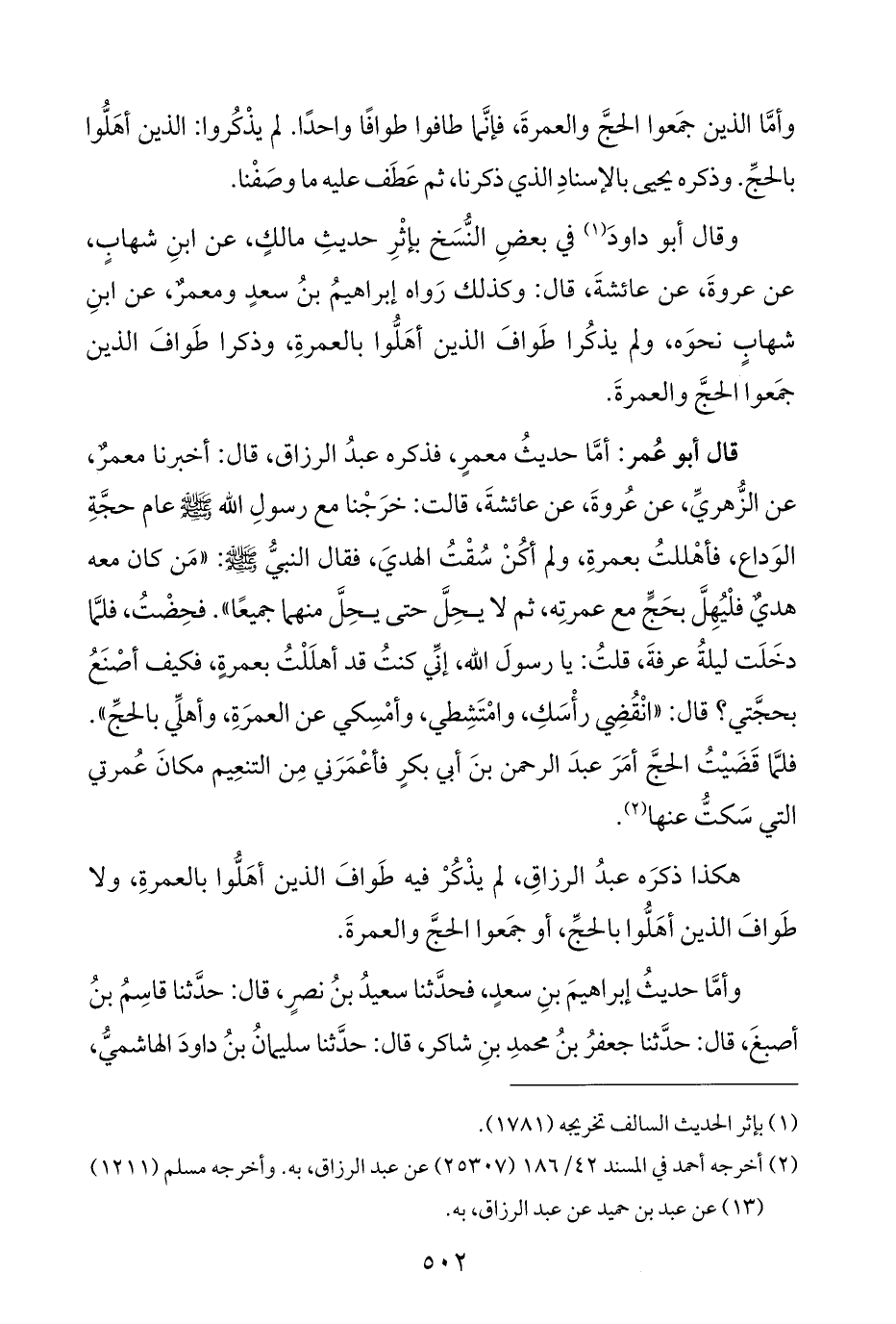 هكذا ذكرَه عبدُ الرزاقِ، لم يذْكُرْ فيه طَوافَ الذين أهَلُّوا بالعمرةِ، ولا طَوافَ الذين أهَلُّوا بالحجِّ، أو جمَعوا الحجَّ والعمرةَ.