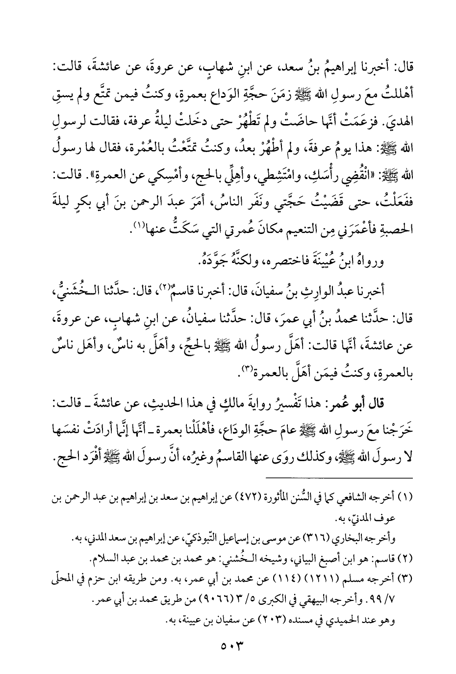قال أبو عُمر: هذا تَفْسيرُ روايةَ مالكٍ في هذا الحديثِ، عن عائشةَ -قالت: خَرَجْنا معَ رسولِ الله -صلى الله عليه وسلم- عامَ حجَّةِ الودَاع، فأهْلَلْنا بعمرة- أنَّها إنَّما أرادَتْ نفسَها لا رسولَ الله -صلى الله عليه وسلم-، وكذلك روَى عنها القاسمُ وغيرُه، أنَّ رسولَ الله -صلى الله عليه وسلم- أفْرَد الحج.