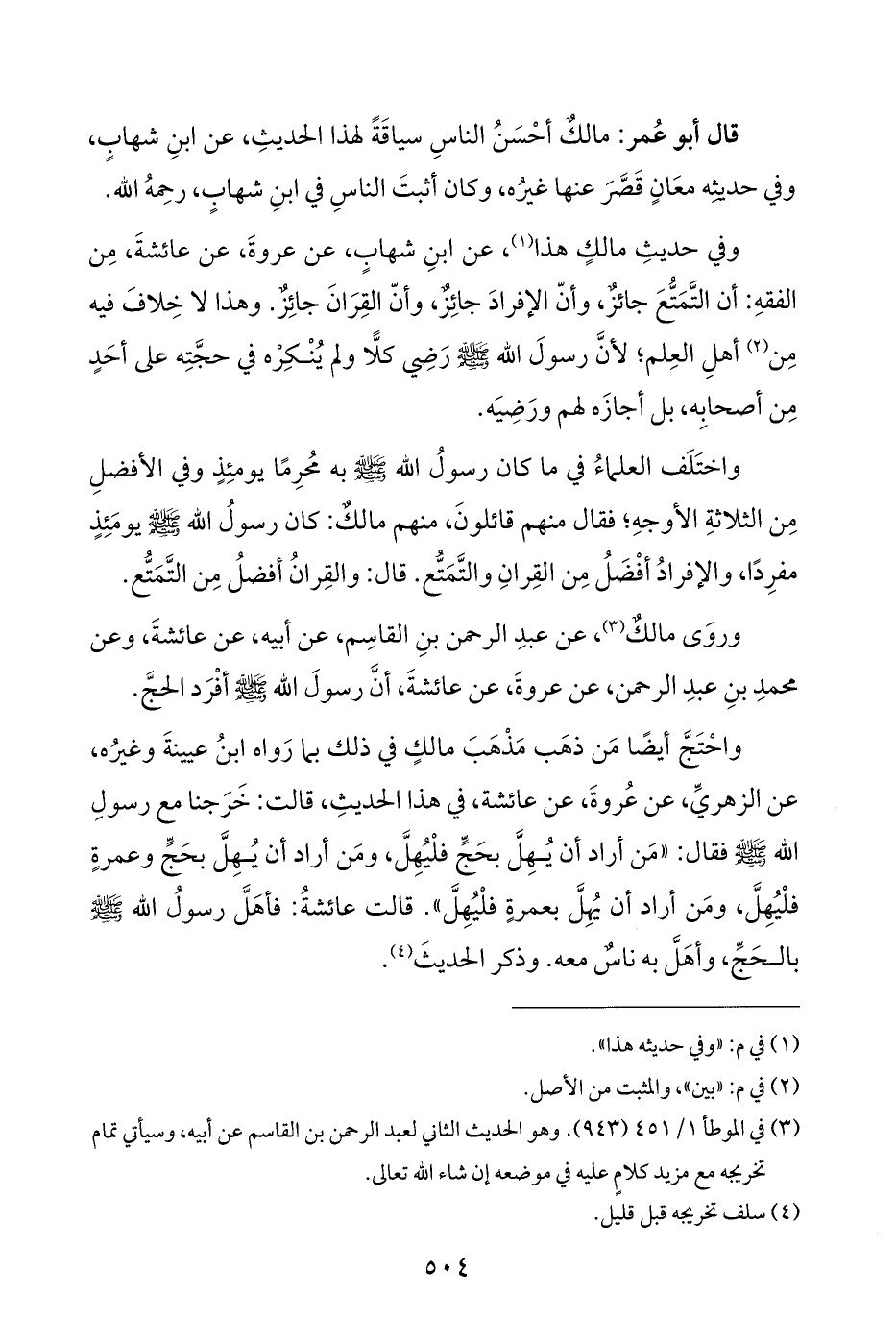 وروَى مالكٌ (¬٣)، عن عبدِ الرحمن بنِ القاسِم، عن أبيه، عن عائشةَ، وعن محمدِ بنِ عبدِ الرحمن، عن عروةَ، عن عائشةَ، أنَّ رسولَ الله - صلى الله عليه وسلم - أفْرَد الحجَّ.
