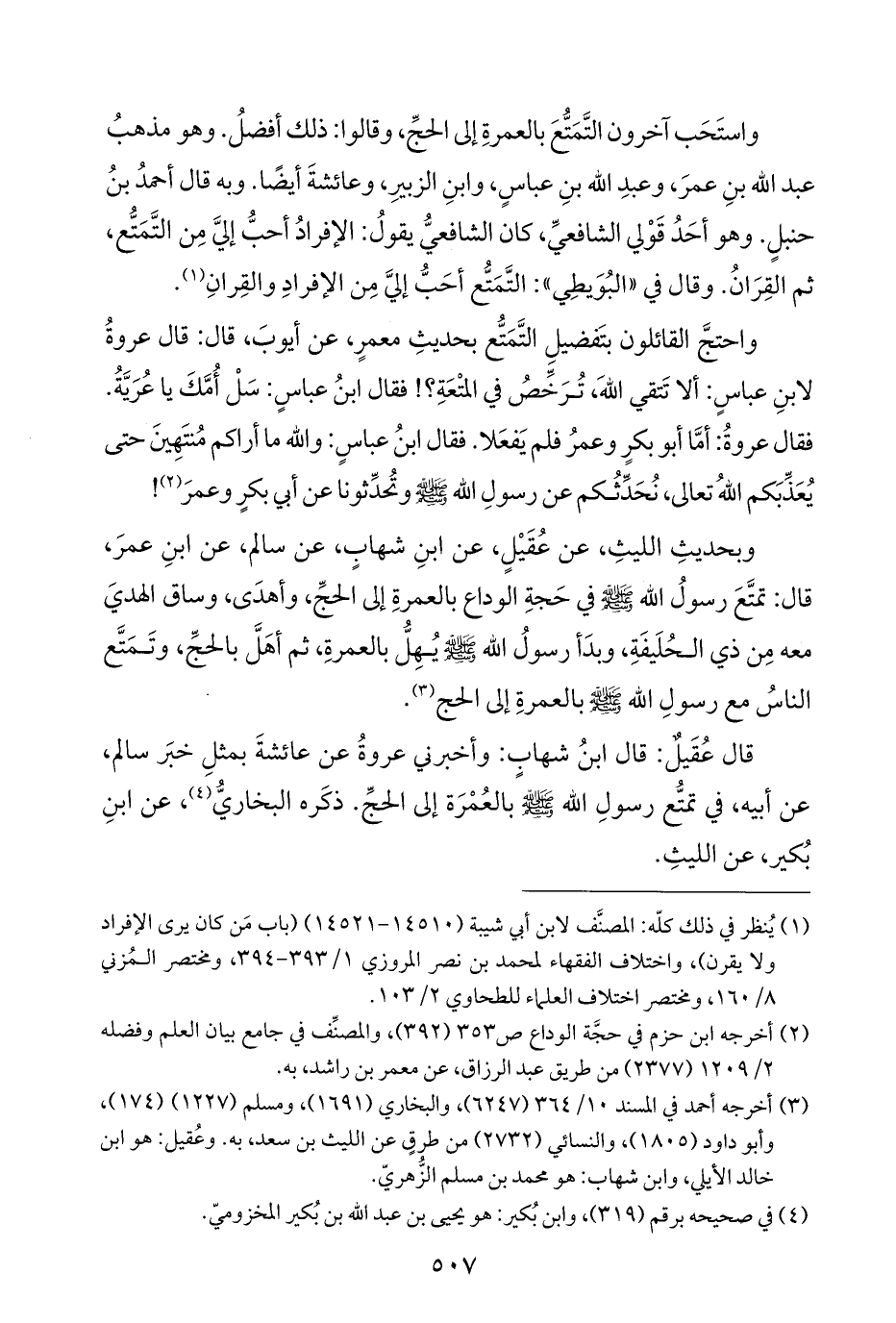 (¬١) يُنظر في ذلك كلّه: المصنَّف لابن أبي شيبة (١٤٥١٠ - ١٤٥٢١) (باب مَن كان يرى الإفراد ولا يقرن)، واختلاف الفقهاء لمحمد بن نصر المروزي ١/ ٣٩٣ - ٣٩٤، ومختصر المُزني ٨/ ١٦٥، ومختصر اختلاف العلماء للطحاوي ٢/ ١٥٣.