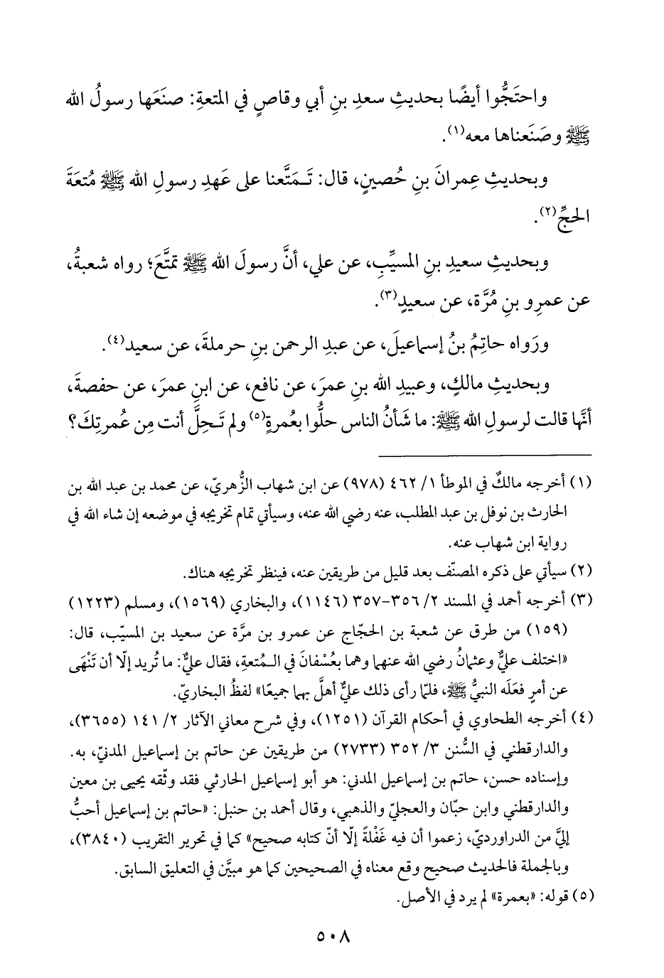 واحتَجُّوا أيضًا بحديثِ سعدِ بنِ أبي وقاصٍ في المتعةِ: صنَعَها رسولُ الله - صلى الله عليه وسلم - وصَنَعناها معه (¬١).