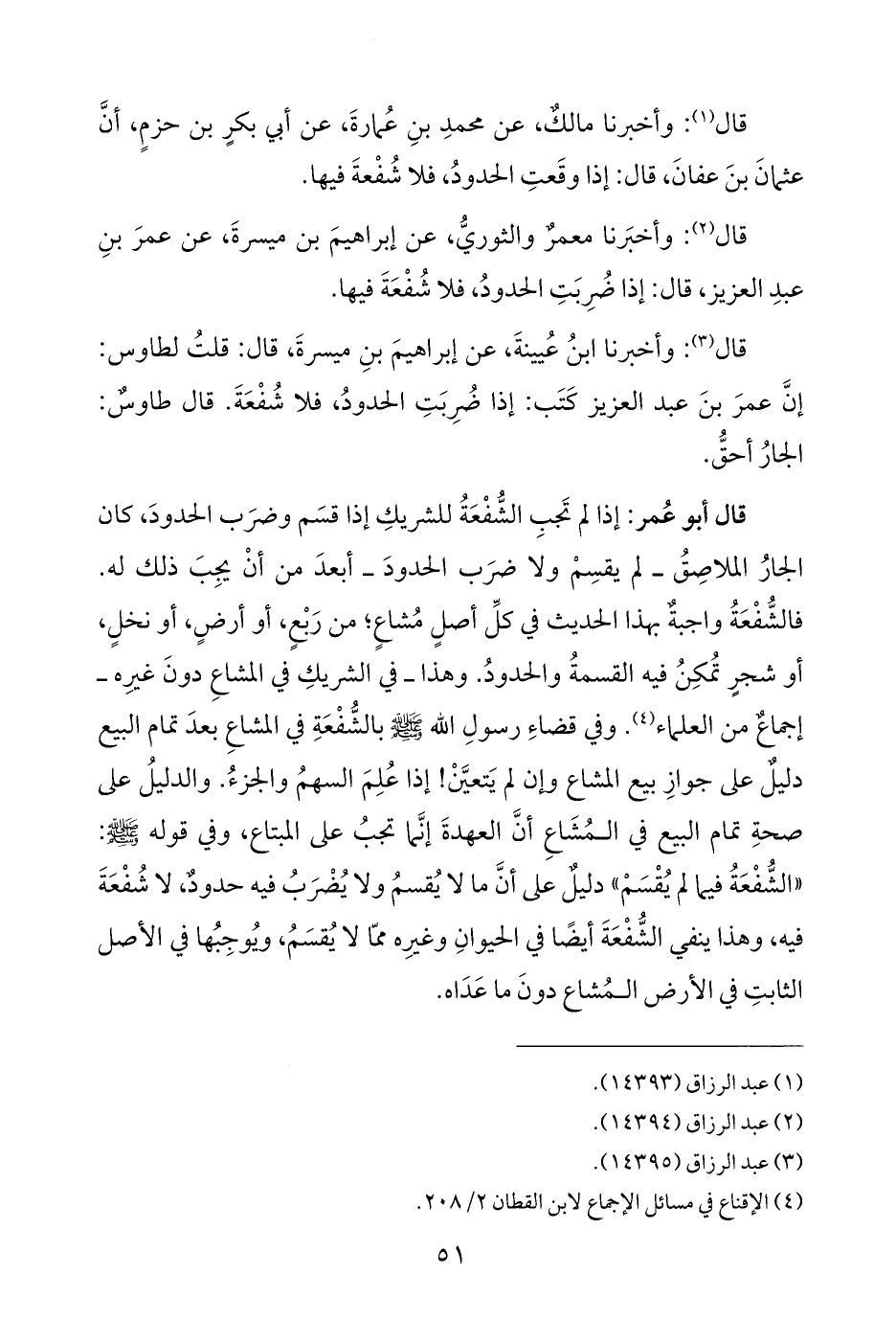 قال (¬١): وأخبرنا مالكٌ، عن محمدِ بنِ عُمارةَ، عن أبي بكرٍ بن حزمٍ، أنَّ عثمانَ بنَ عفانَ، قال: إذا وقَعتِ الحدودُ، فلا شُفْعةَ فيها.
