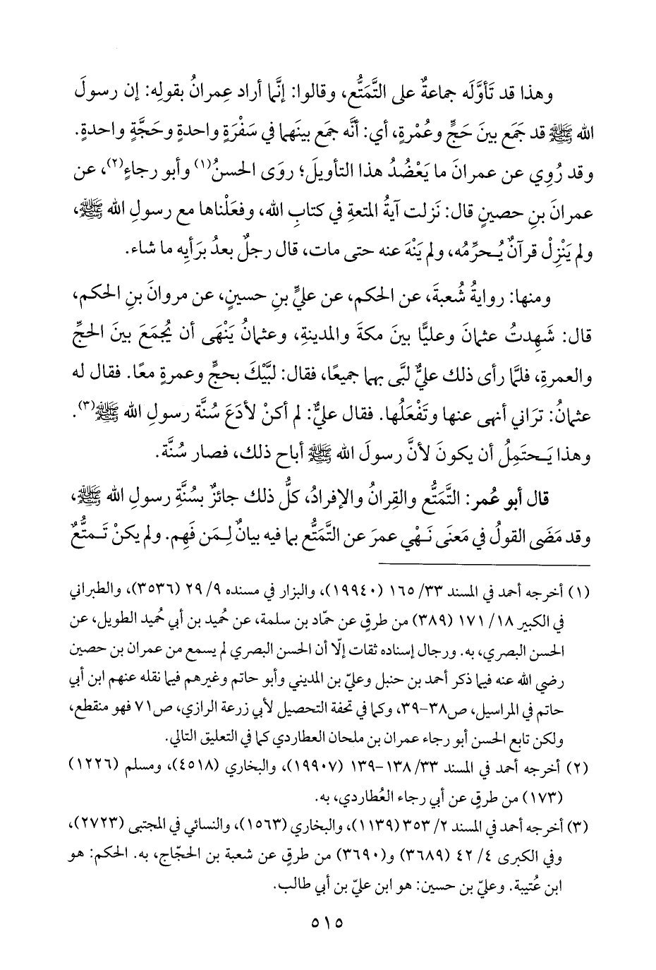 ومنها: روايةُ شُعبةَ، عن الحكم، عن عليٍّ بنِ حسينٍ، عن مروانَ بنِ الحكم، قال: شَهِدتُ عثمانَ وعليًّا بينَ مكةَ والدينةِ، وعثمانُ يَنْهَى أن يُجمَعَ بينَ الحجِّ والعمرةِ، فلمَّا رأى ذلك عليٌّ لبَّى بهما جميعًا، فقال: لبَّيْكَ بحجٍّ وعمرِة معًا. فقال له عثمانُ: ترَاني أنهى عنها وتَفْعَلُها. فقال عليٌّ: لم أكنْ لأدَعَ سُنَّة رسولِ الله - صلى الله عليه وسلم - (¬٣). وهذا يَحتَمِلُ أن يكونَ لأنَّ رسولَ الله - صلى الله عليه وسلم - أباح ذلك، فصار سُنَّة.