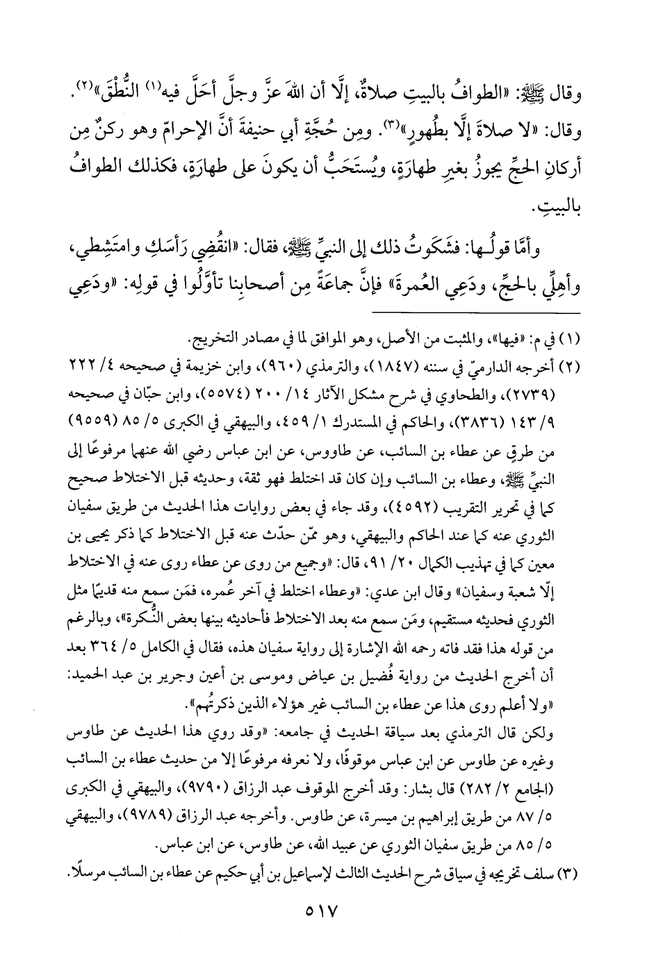 وقال - صلى الله عليه وسلم -: "الطوافُ بالبيتِ صلاةٌ، إلَّا أن اللهَ عزَّ وجلَّ أحَلَّ فيه (¬١) النُّطْقَ" (¬٢). وقال: "لا صلاةَ إلَّا بطُهورٍ" (¬٣). ومن حُجَّةِ أبي حنيفةَ أنَّ الإحرامَ وهو ركنٌ مِن أركانِ الحجِّ يجوزُ بغيرِ طهارَةٍ، ويُستَحَبُّ أن يكونَ على طهارةٍ، فكذلك الطوافُ بالبيتِ.
