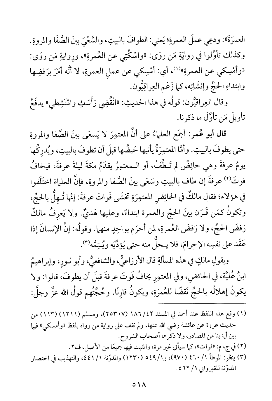 قال أبو عُمر: أجمَع العلماءُ على أنَّ المعتمِرَ لا يَسعَى بينَ الصَّفا والمروةِ حتى يطوفَ بالبيتِ. وأمَّا المعتمِرَةُ يأتيها حَيضُها قبلَ أن تطوفَ بالبيتِ، ويُدرِكُها يومُ عرفةَ وهي حائِضٌ لم تَطُفْ، أو المعتمِرُ يقدَمُ مكةَ ليلةَ عرفةَ، فيخافُ فوتَ (¬٢) عرفةَ إن طاف بالبيتِ وسَعَى بينَ الصَّفا والمروة، فإنَّ العلماءَ اختَلَفوا في هؤلاء؛ فقال مالكٌ في الحائِضِ المعتمِرَةِ تخشَى فَواتَ عرفةَ: إنَّها تُهِلُّ بالحجِّ، وتكونُ كمَن قَرَن بينَ الحجّ والعمرة ابتداءً، وعليها هَديٌ. ولا يَعرِفُ مالكٌ رَفضَ الحجِّ، ولا رَفضَ العُمرةِ، لمن أحرَم بواحِدٍ منهما. وقولُه: إنَّ الإنسانَ إذا عَقَد على نفسِه الإحرامَ، فلا يحلُّ منه حتى يُؤدِّيَه ويُتِمَّه (¬٣).