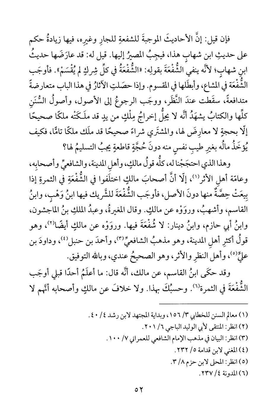 فإن قيل: إنَّ الأحاديثَ الموجبةَ للشفعةِ للجارِ وغيرِه، فيها زيادةُ حكم على حديثِ ابن شهابٍ هذا، فيجِبُ المصيرُ إليها. قيل له: قد عارَضَها حديثُ ابنِ شهابٍ؛ لأنَّه ينفي الشُّفْعَةَ بقولِه: "الشُّفْعَةُ في كلِّ شِركٍ لم يُقْسَمْ". فأوجَب الشُّفْعَة في المشاع، وأبطَلها في المقسوم. وإذا حصلتِ الآثارُ في هذا الباب متعارضةً متدافعةً، سقَطت عندَ النَّظَر، ووجَب الرجوعُ إلى الأصول، وأصولُ السُّنَنِ كلِّها والكتابُ يشهَدُ أنَّه لا يحِلُّ إخراجُ مِلْكٍ من يدٍ قد ملَكَتْه ملكًا صحيحًا إلّا بحجةٍ لا معارِضَ لها، والمشتَري شراءً صحيحًا قد ملَك ملكًا تامًّا، فكيف يُؤخَذُ مالُه بغيرِ طيبِ نفسٍ منه دونَ حُجَّةٍ قاطعةٍ يجبُ التسليمُ لها؟