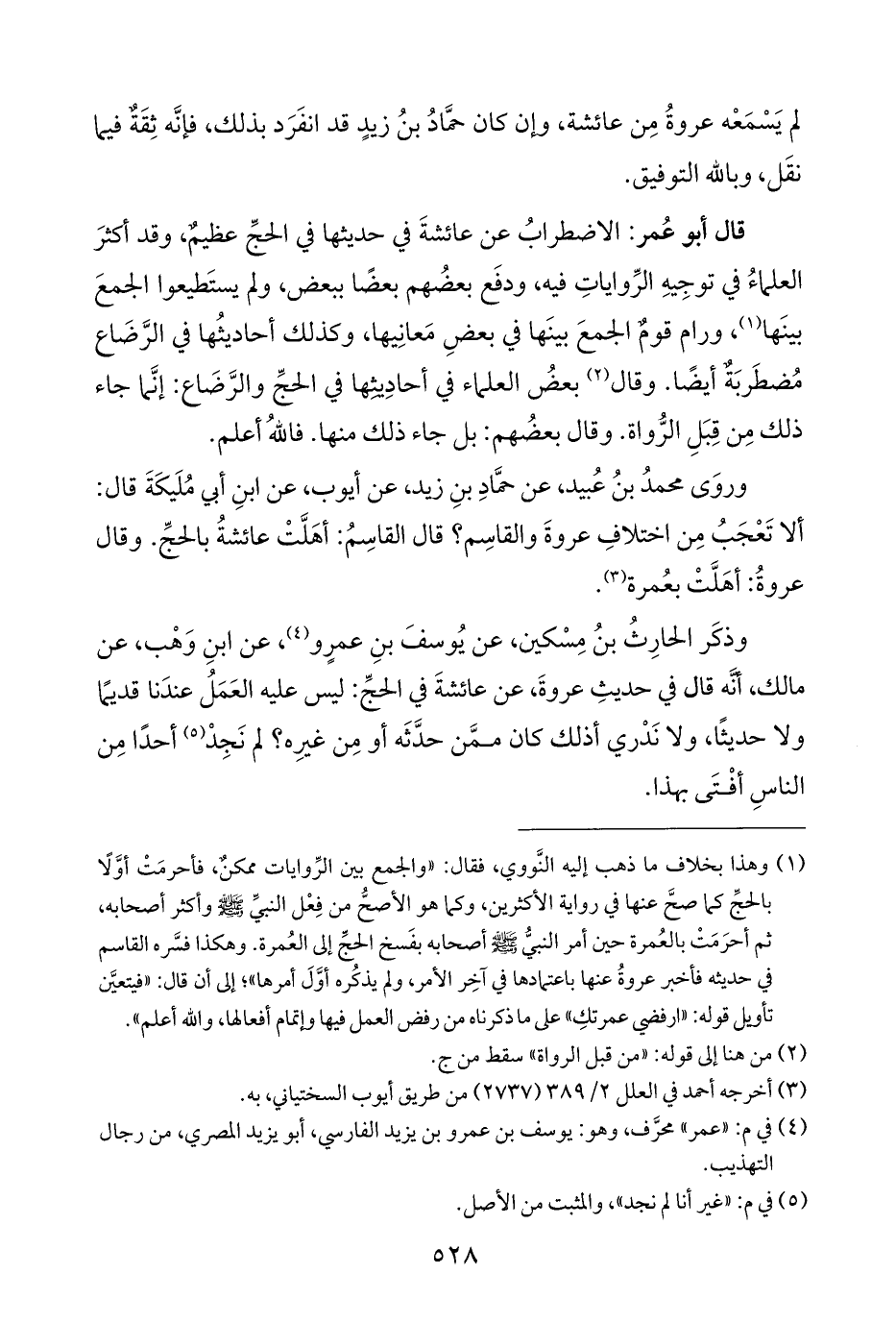 قال أبو عُمر: الاضطرابُ عن عائشةَ في حديثها في الحجِّ عظيمٌ، وقد أكثرَ العلماءُ في توجِيهِ الرِّواياتِ فيه، ودفَع بعضُهم بعضًا ببعض، ولم يستَطيعوا الجمعَ بينَها (¬١)، ورام قومٌ الجمعَ بينَها في بعضِ مَعانِيها، وكذلك أحاديثُها في الرَّضَاع مُضطَربَةٌ أيضًا. وقال (¬٢) بعضُ العلماء في أحادِيثها في الحجِّ والرَّضَاع: إنَّما جاء ذلك مِن قِبَلِ الرُّواة. وقال بعضُهم: بل جاء ذلك منها. فاللهُ أعلم.
