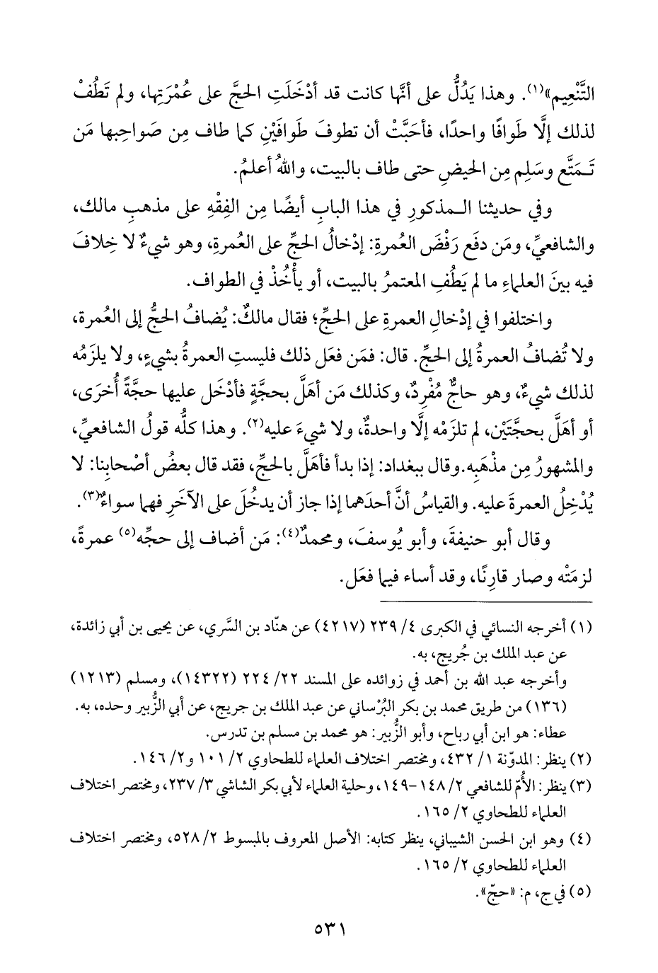 وفي حديثنا المذكورِ في هذا البابِ أيضًا مِن الفِقْهِ على مذهبِ مالك، والشافعيِّ، ومَن دفَع رَفْضَ العُمرةِ: إدْخالُ الحجِّ على العُمرةِ، وهو شيءٌ لا خِلافَ فيه بينَ العلماءِ ما لم يَطُفِ المعتمرُ بالبيت، أو يأْخُذْ في الطواف.