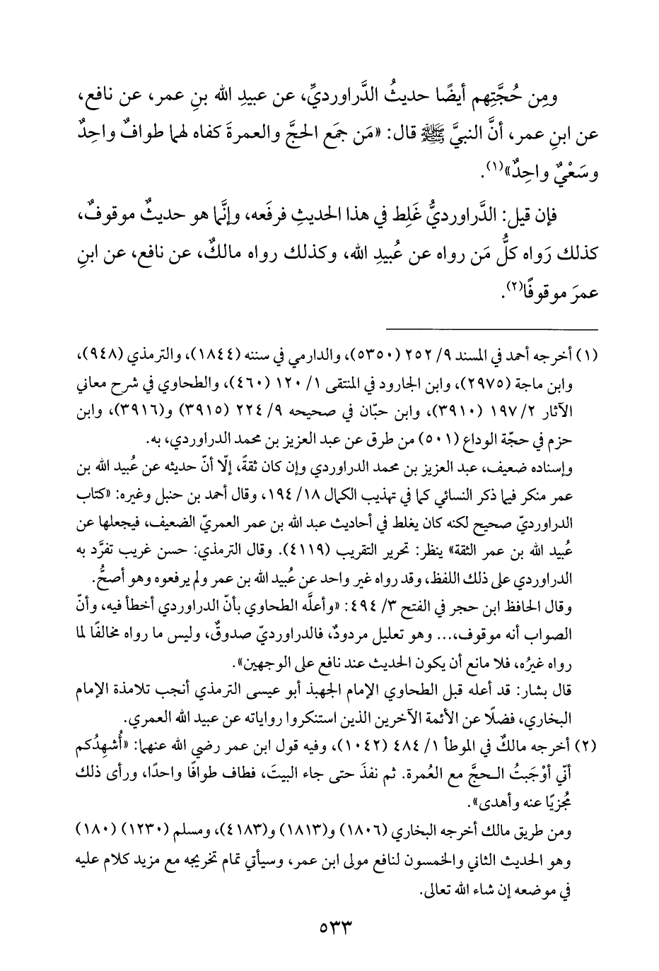 (¬١) أخرجه أحمد في المسند ٩/ ٢٥٢ (٥٣٥٠)، والدارمي في سننه (١٨٤٤)، والترمذي (٩٤٨)، وابن ماجة (٢٩٧٥)، وابن الجارود في المنتقى ١/ ١٢٠ (٤٦٠)، والطحاوي في شرح معاني الآثار ٢/ ١٩٧ (٣٩١٠)، وابن حبّان في صحيحه ٩/ ٢٢٤ (٣٩١٥) و (٣٩١٦)، وابن حزم في حجّة الوداع (٥٠١) من طرق عن عبد العزيز بن محمد الدراوردي، به.