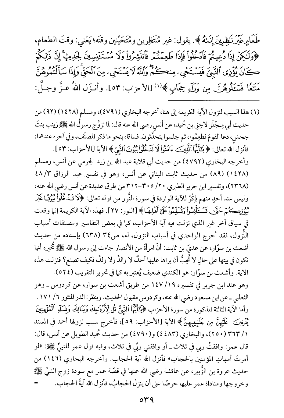 وأخرجه البخاري (٤٧٩٢) من حديث أبي قلابة عبد الله بن زيد الجرمي عن أنس، ومسلم (١٤٢٨) (٨٩) من حديث ثابت البناني عن أنس، وهو في تفسير عبد الرزاق ٣/ ٤٨ (٢٣٦٨)، وتفسير ابن جرير الطبري ٢٠/ ٣٠٥ - ٣١٢ من طرق عديدة عن أنس رضي الله عنه، وليس عند أحدٍ منهم ذِكْرٌ للآية الواردة في سورة النُّور من قوله تعالى: {لَا تَدْخُلُوا بُيُوتًا غَيْرَ بُيُوتِكُمْ حَتَّى تَسْتَأْنِسُوا وَتُسَلِّمُوا عَلَى أَهْلِهَا} [النور: ٢٧]. فهذه الآية الكريمة إنما وقعت في سياق آخر غير الذي نزلت فيه آية الأحزاب، كما في بعض التفاسير ومصنفات أسباب النُّزول، فقد أخرج الواحدي في أسباب النزول، له، ص ٣٤ (٦٣٨) بإسناده من حديث أشعث بن سوّار، عن عديّ بن ثابت: أنّ امرأةً من الأنصار جاءت إلى رسول الله - صلى الله عليه وسلم - تُخبره أنها تكون في بيتها على حالٍ لا تُحِبُّ أن يراها عليها أحدٌ، لا والدٌ ولا ولدٌ، فكيف تصنع؟ فنزلت هذه الآية. وأشعث بن سوّار: هو الكندي ضعيف يُعتبر به كما في تحرير التقريب (٥٢٤).