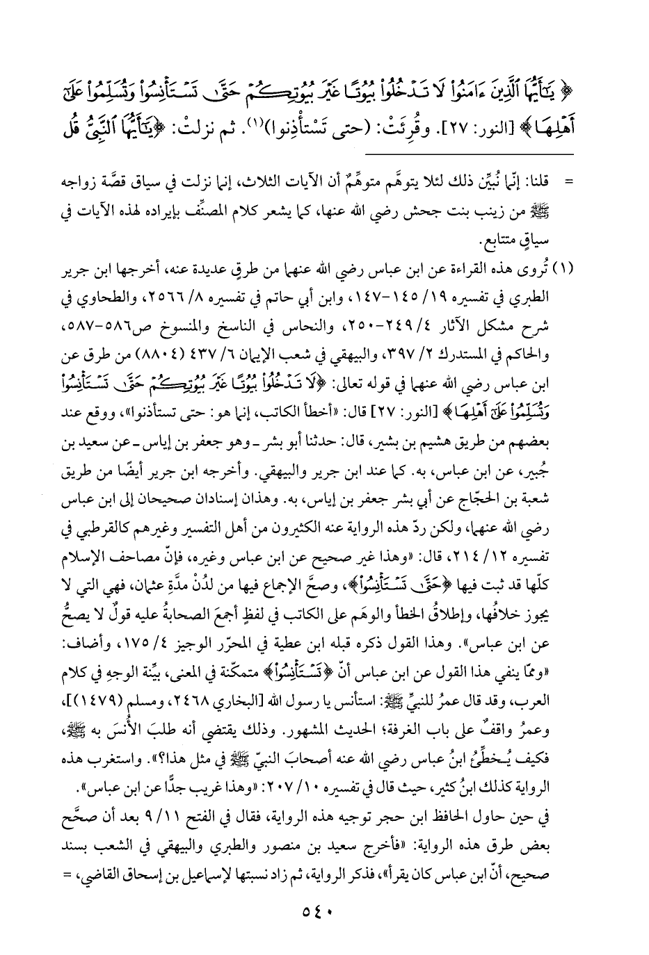 (¬١) تُروى هذه القراءة عن ابن عباس رضي الله عنهما من طرقٍ عديدة عنه، أخرجها ابن جرير الطبري في تفسيره ١٩/ ١٤٥ - ١٤٧، وابن أبي حاتم في تفسيره ٨/ ٢٥٦٦، والطحاوي في شرح مشكل الآثار ٤/ ٢٤٩ - ٢٥٠، والنحاس في الناسخ والمنسوخ ص ٥٨٦ - ٥٨٧، والحاكم في المستدرك ٢/ ٣٩٧، والبيهقي في شعب الإيمان ٦/ ٤٣٧ (٨٨٠٤) من طرق عن ابن عباس رضي الله عنهما في قوله تعالى: {يَاأَيُّهَا الَّذِينَ آمَنُوا لَا تَدْخُلُوا بُيُوتًا غَيْرَ بُيُوتِكُمْ حَتَّى تَسْتَأْنِسُوا وَتُسَلِّمُوا عَلَى أَهْلِهَا} [النور: ٢٧] قال: "أخطأ الكاتب، إنما هو: حتى تستأذنوا"، ووقع عند بعضهم من طريق هشيم بن بشير، قال: حدثنا أبو بشر - وهو جعفر بن إياس - عن سعيد بن جُبير، عن ابن عباس، به. كما عند ابن جرير والبيهقي. وأخرجه ابن جرير أيضًا من طريق شعبة بن الحجّاج عن أبي بشر جعفر بن إياس، به. وهذان إسنادان صحيحان إلى ابن عباس رضي الله عنهما، ولكن ردّ هذه الرواية عنه الكثيرون من أهل التفسير وغيرهم كالقرطبي في تفسيره ١٢/ ٢١٤، قال: "وهذا غير صحيح عن ابن عباس وغيره، فإنّ مصاحف الإسلام كلّها قد ثبت فيها {حَتَّى تَسْتَأْنِسُوا}، وصحَّ الإجماع فيها من لدُنْ مدَّةِ عثمان، فهي التي لا يجوز خلافُها، وإطلاقُ الخطأ والوهَم على الكاتب في لفظٍ أجمعَ الصحابةُ عليه قولٌ لا يصحُّ عن ابن عباس". وهذا القول ذكره قبله ابن عطية في المحرّر الوجيز ٤/ ١٧٥، وأضاف: "وممّا ينفي هذا القول عن ابن عباس أنّ {تَسْتَأْنِسُوا} متمكّنة في المعنى، بيِّنة الوجهِ في كلام العرب، وقد قال عمرُ للنبيِّ - صلى الله عليه وسلم -: استأنس يا رسول الله [البخاري ٢٤٦٨، ومسلم (١٤٧٩)]، وعمرُ واقفٌ على باب الغرفة؛ الحديث المشهور. وذلك يقتضي أنه طلبَ الأُنسَ به - صلى الله عليه وسلم -، فكيف يُخطِّئُ ابنُ عباس رضي الله عنه أصحابَ النبيّ - صلى الله عليه وسلم - في مثل هذا؟ ". واستغرب هذه الرواية كذلك ابنُ كثير، حيث قال في تفسيره ١٠/ ٢٠٧: "وهذا غريب جدًّا عن ابن عباس".