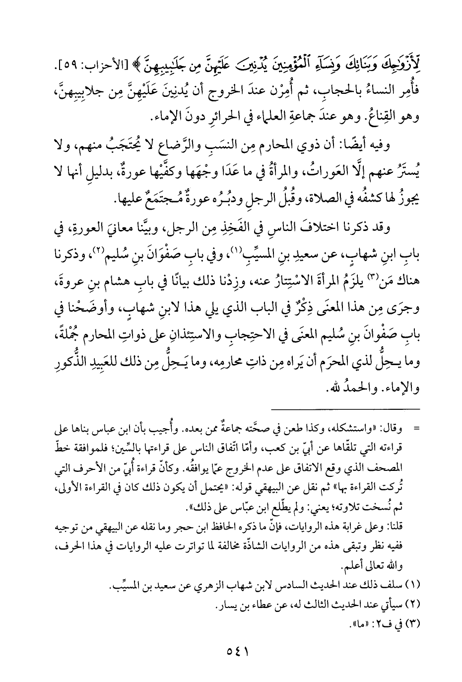 وقد ذكرنا اختلافَ الناسِ في الفَخِذِ مِن الرجل، وبيَّنا معانيَ العورةِ، في بابِ ابنِ شهابٍ، عن سعيدِ بنِ المسيِّبِ (¬١)، وفي بابِ صَفْوَانَ بنِ سُليم (¬٢)، وذكرنا هناك مَن (¬٣) يلزَمُ المرأةَ الاسْتِتارُ عنه، وزِدْنا ذلك بيانًا في بابِ هشام بنِ عروةَ، وجرَى مِن هذا المعنَى ذِكْرٌ في الباب الذي يلي هذا لابنِ شهابٍ، وأوضَحْنا في بابِ صَفْوانَ بنِ سُليم المعنَى في الاحتِجابِ والاستِئذانِ على ذواتِ المحارم جُمْلةً، وما يحِلُّ لذي المحرَم أن يَراه مِن ذاتِ محارمه، وما يَحِلُّ مِن ذلك للعَبِيدِ الذُّكورِ والإماء. والحمدُ لله.