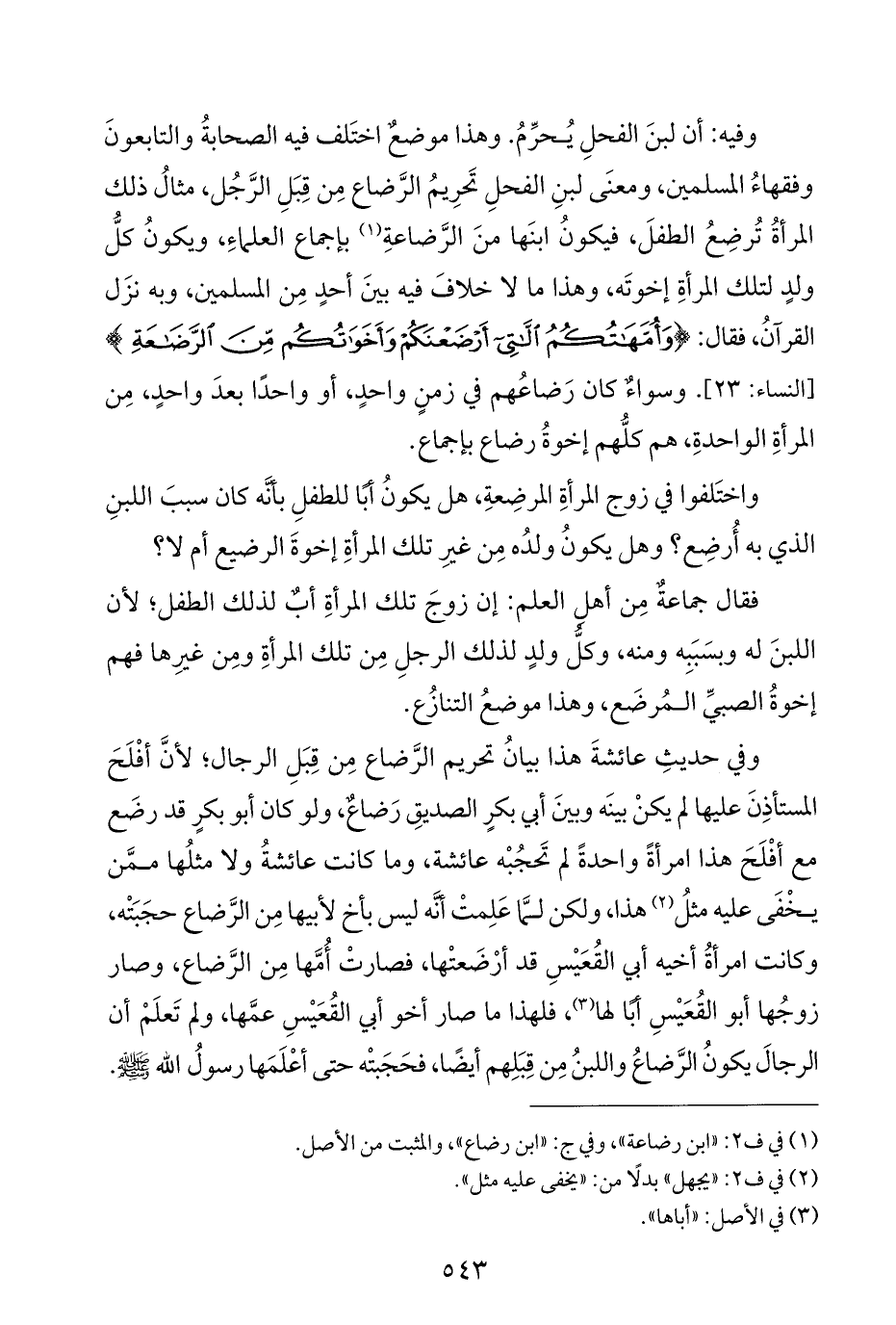 فقال جماعةٌ مِن أهل العلم: إن زوجَ تلك المرأةِ أبٌ لذلك الطفل؛ لأن اللبنَ له وبسَبَبِه ومنه، وكلُّ ولدٍ لذلك الرجلِ مِن تلك المرأةِ ومِن غيرِها فهم إخوةُ الصبيِّ المُرضَع، وهذا موضعُ التنازُع.