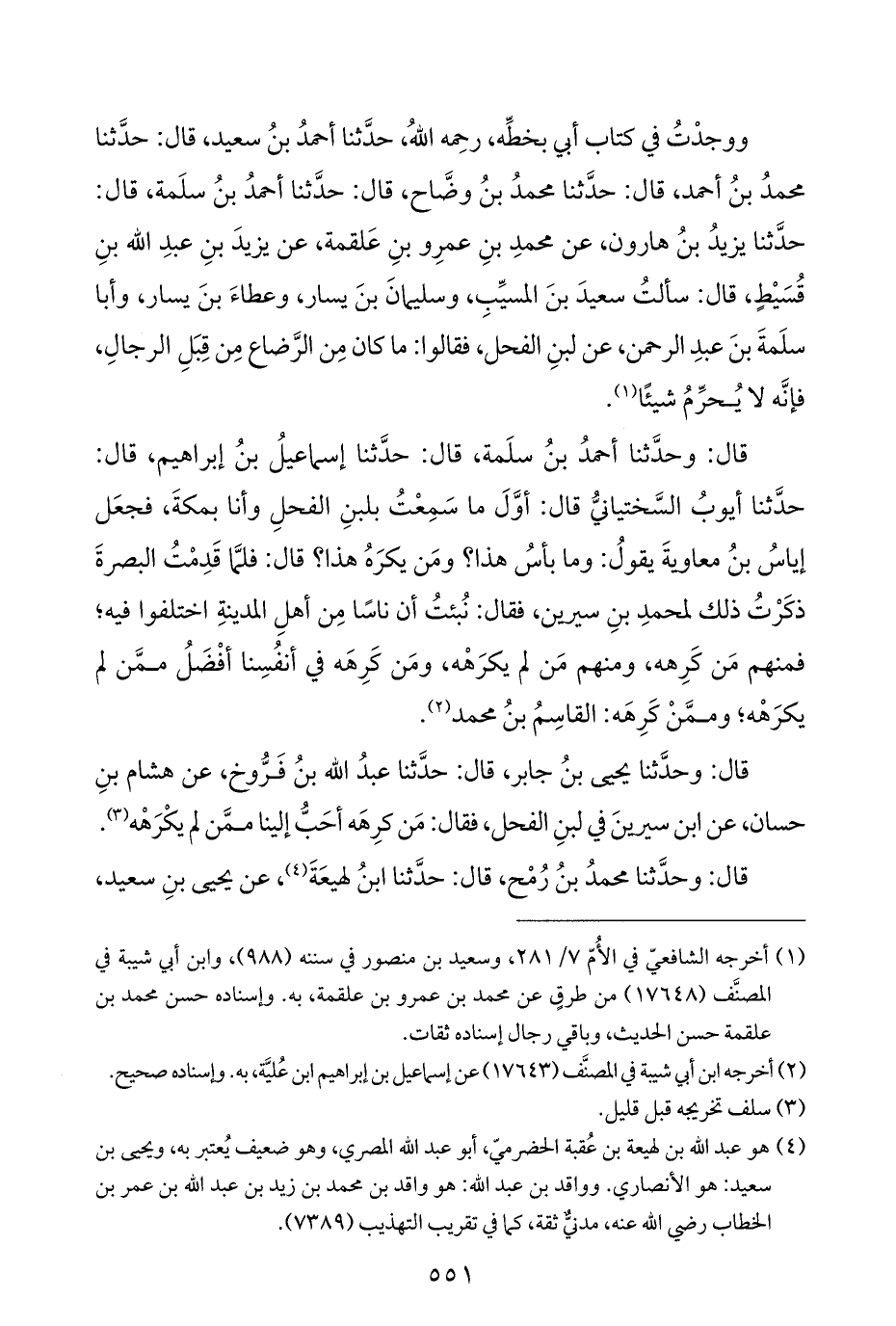 قال: وحدَّثنا أحمدُ بنُ سلَمة، قال: حدَّثنا إسماعيلُ بنُ إبراهيم، قال: حدَّثنا أيوبُ السَّختيانيُّ قال: أوَّلَ ما سَمِعْتُ بلبنِ الفحلِ وأنا بمكةَ، فجعَل إياسُ بنُ معاويةَ يقولُ: وما بأسُ هذا؟ ومَن يكرَهُ هذا؟ قال: فلمَّا قَدِمْتُ البصرةَ ذكَرْتُ ذلك لمحمدِ بنِ سيرين، فقال: نُبئتُ أن ناسًا مِن أهلِ المدينةِ اختلفوا فيه؛ فمنهم مَن كَرِهه، ومنهم مَن لم يكرَهْه، ومَن كَرِهَه في أنفُسِنا أفْضَلُ ممَّن لم يكرَهْه؛ وممَّنْ كَرِهَه: القاسِمُ بنُ محمد (¬٢).