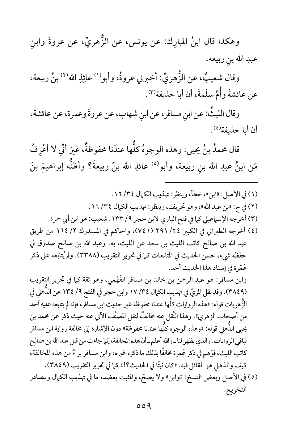 وابن مسافر: هو عبد الرحمن بن خالد بن مسافر الفَهْمي، وهو ثقة كما في تحرير التقريب (٣٨٤٩). وقد نقل المزيّ في تهذيب الكمال ٣٤/ ١٧ وابن حجر في الفتح ٩/ ١٣٤ عن الذُّهلي في الزُّهريات قوله: "هذه الروايات كلُّها عندنا محفوظة غير حديث ابن مسافر، فإنه لم يتابعه عليه أحد من أصحاب الزهري". وهذا النَّقل عنه نحالف لنقل المصنِّف الآتي عنه حيث ذكر عن محمد بن يحيى الذُّهلي قوله: "وهذه الوجوه كلُّها عندنا محفوظة" دون الإشارة إلى مخالفة رواية ابن مسافر لباقي الروايات. والذي يظهر لنا - والله أعلم - أن هذه المخالفة، إنما جاءت من قبل عبد الله بن صالح كاتب الليث، فوَهم في ذكر عَمرة مخالفًا بذلك ما ذكره غيره، وابن مسافر براءٌ من هذه المخالفة، كيف والذهلي هو القائل فيه. "كان ثبتًا في الحديث؟! " كما في تحرير التقريب (٣٨٤٩).