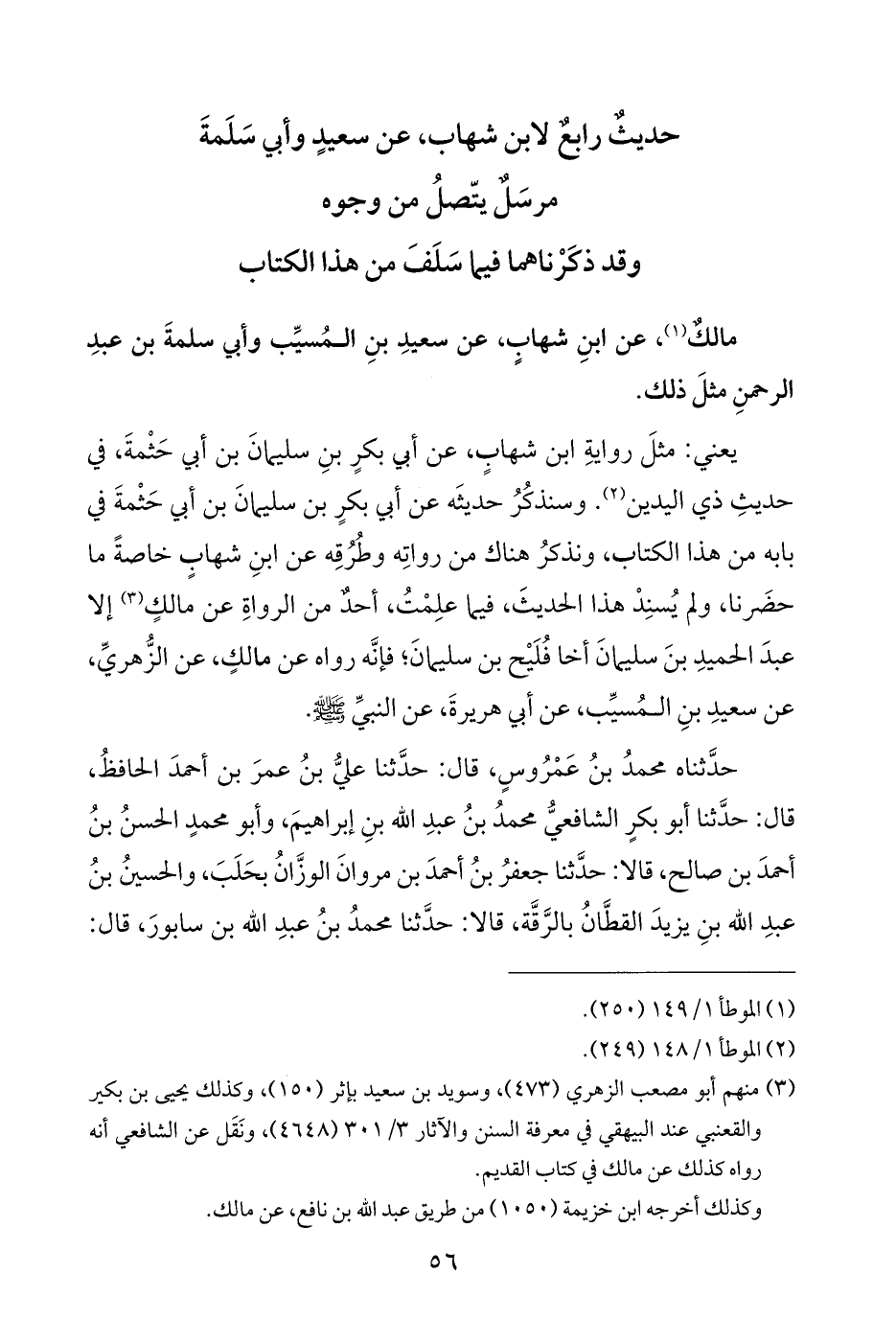 حديثٌ رابعٌ لابن شهاب، عن سعيدٍ وأبي سَلَمةَ مرسَلٌ يتّصلُ من وجوه وقد ذكَرْناهما فيما سَلَفَ من هذا الكتاب