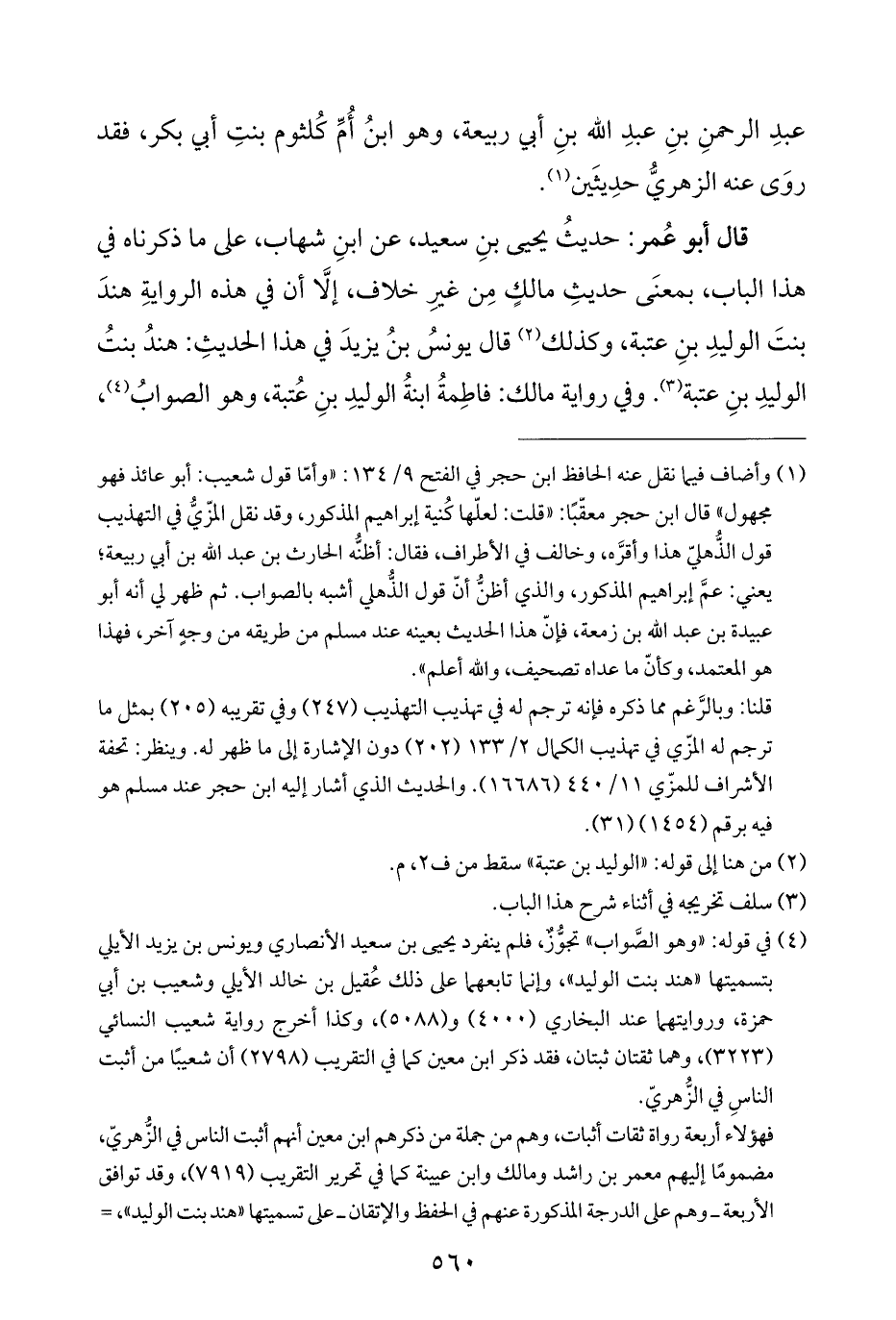 (¬٤) في قوله: "وهو الصَّواب" تجوُّزٌ، فلم ينفرد يحيى بن سعيد الأنصاري ويونس بن يزيد الأيلي بتسميتها "هند بنت الوليد"، وإنما تابعهما على ذلك عُقيل بن خالد الأيلي وشعيب بن أبي حمزة، وروايتهما عند البخاري (٤٠٠٠) و (٥٠٨٨)، وكذا أخرج رواية شعيب النسائي (٣٢٢٣)، وهما ثقتان ثبتان، فقد ذكر ابن معين كما في التقريب (٢٧٩٨) أن شعيبًا من أثبت الناسِ في الزُّهريّ.
