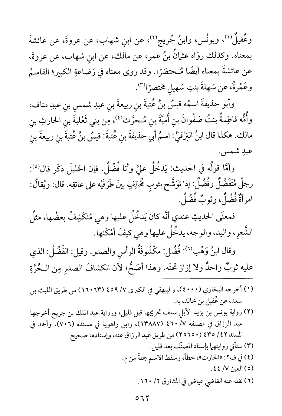وأمَّا قولُه في الحديث: يَدخُلُ عليَّ وأنا فُضُلٌ. فإن الخليلَ ذكَر قال (¬٥): رجلٌ مُتَفَضِّلٌ وفُضُلٌ: إذا توَشَّح بثوبٍ مُخالِفٍ بينَ طَرَفَيْه على عاتقِه. قال: ويُقالُ: امرأةٌ فُضُلٌ، وثوبٌ فُضُلٌ.