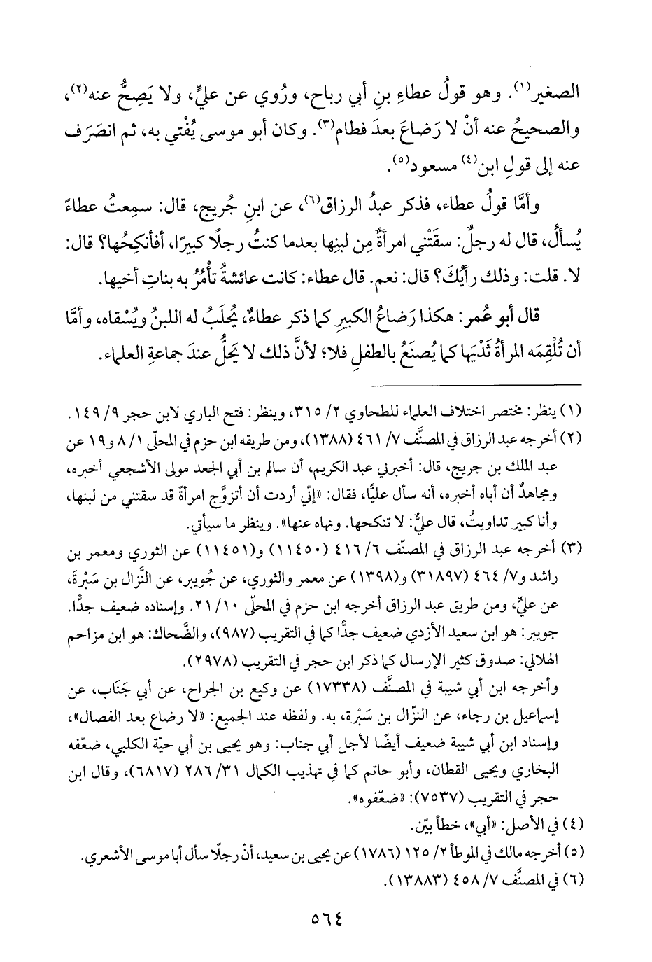 (¬٣) أخرجه عبد الرزاق في المصنّف ٦/ ٤١٦ (١١٤٥٠) و (١١٤٥١) عن الثوري ومعمر بن راشد و ٧/ ٤٦٤ (٣١٨٩٧) و (١٣٩٨) عن معمر والثوري، عن جُويبر، عن النَّزال بن سَبْرةَ، عن عليٍّ، ومن طريق عبد الرزاق أخرجه ابن حزم في المحلّى ١٠/ ٢١. وإسناده ضعيف جدًّا.